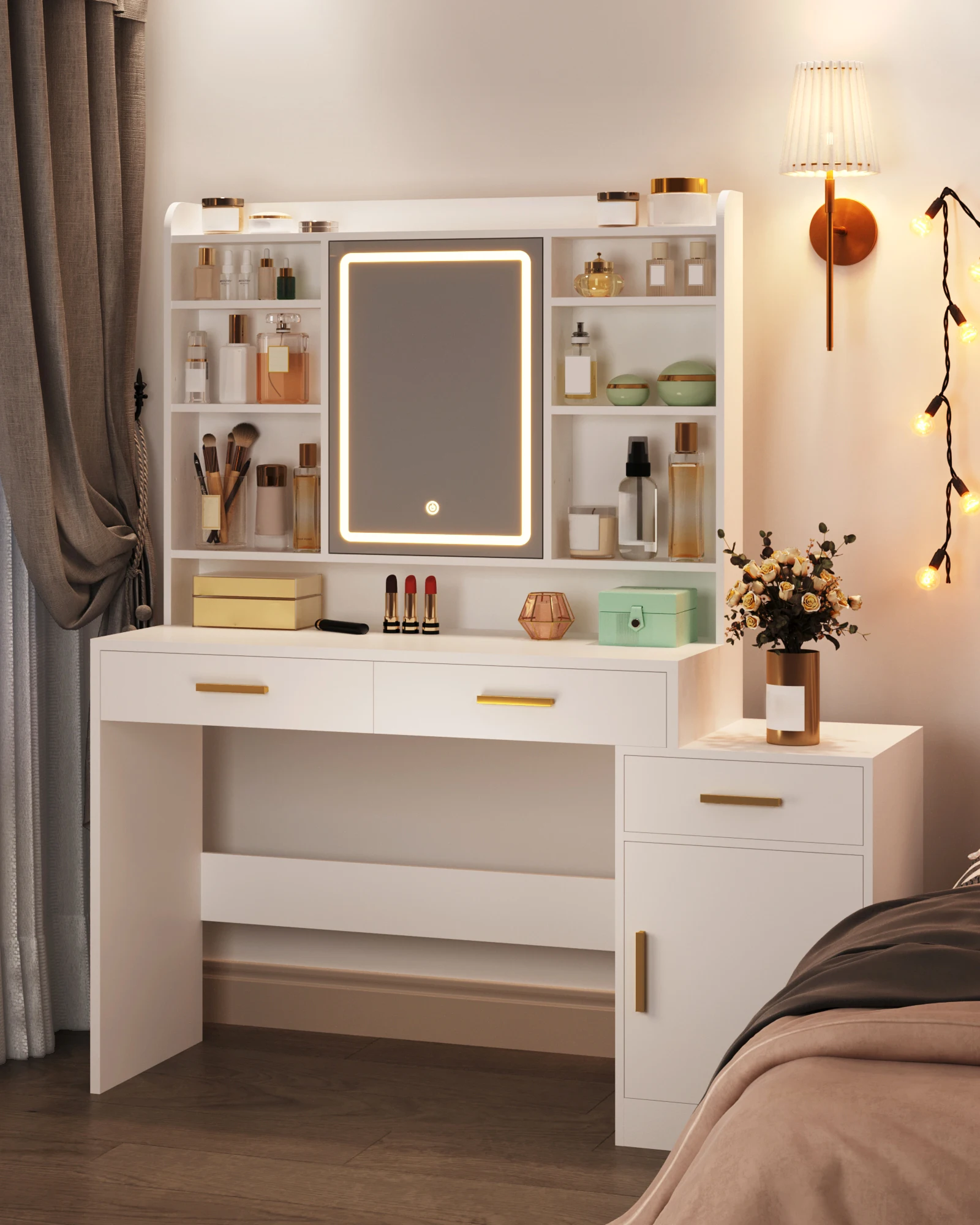 【Мощная функция хранения】под столом есть 2 ящика, в которые можно положить косметические инструменты, браслеты, серьги и т. д., что сделает ваш туалетный столик более аккуратным и аккуратным.А шкаф с правой стороны обеспечивает больше места для хранения, позволяет легко хранить большие предметы коллекционирования, подарки, а также размещать сумки, головные уборы и т. д.для удовлетворения ваших различных потребностей в хранении.