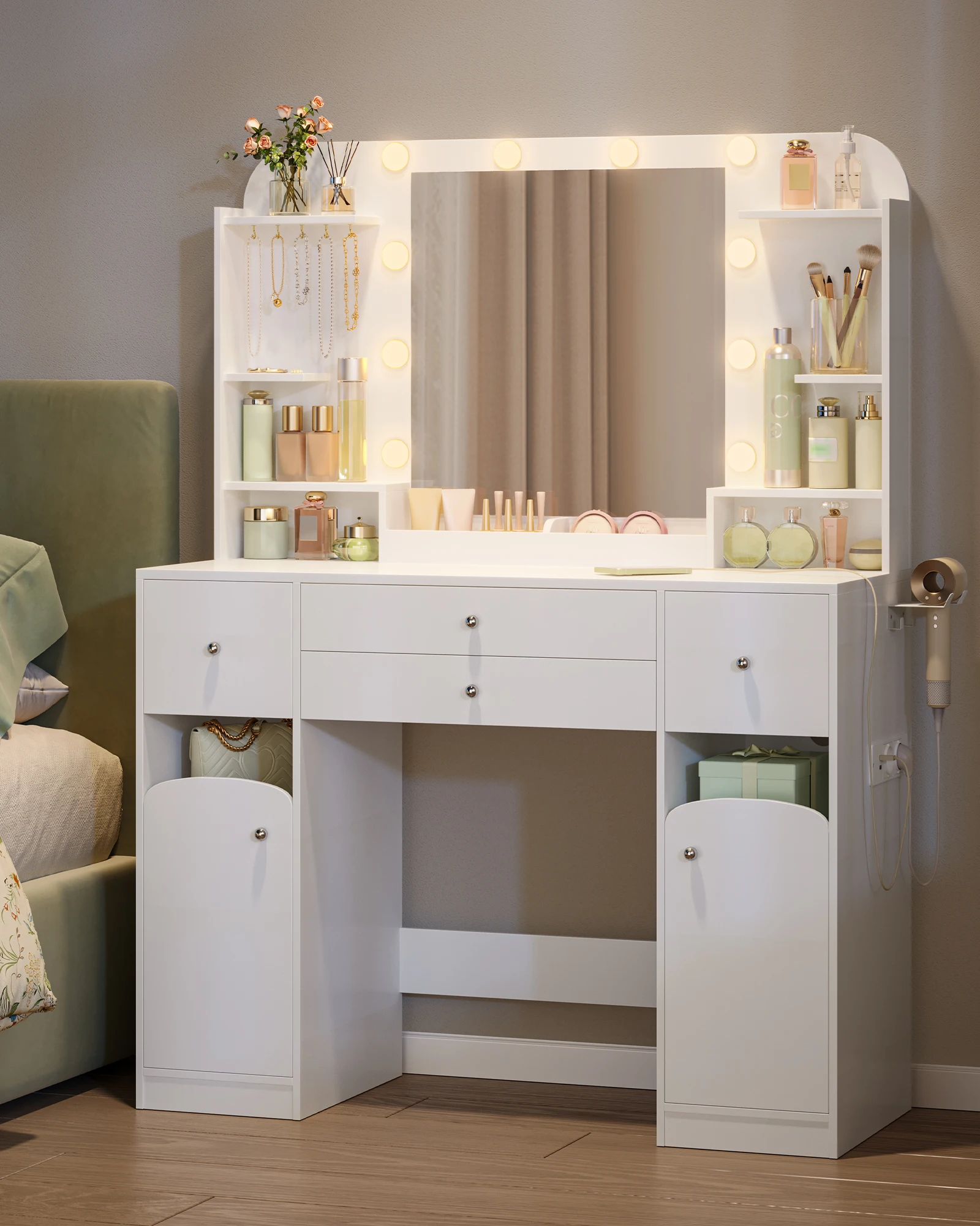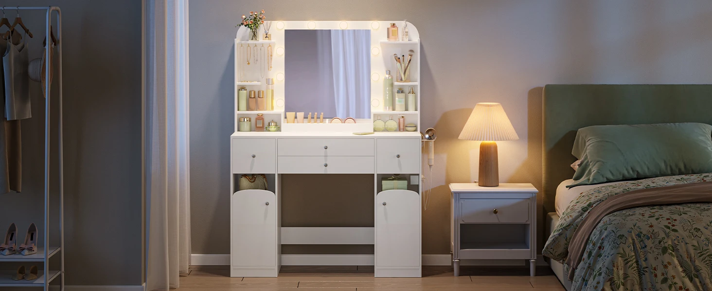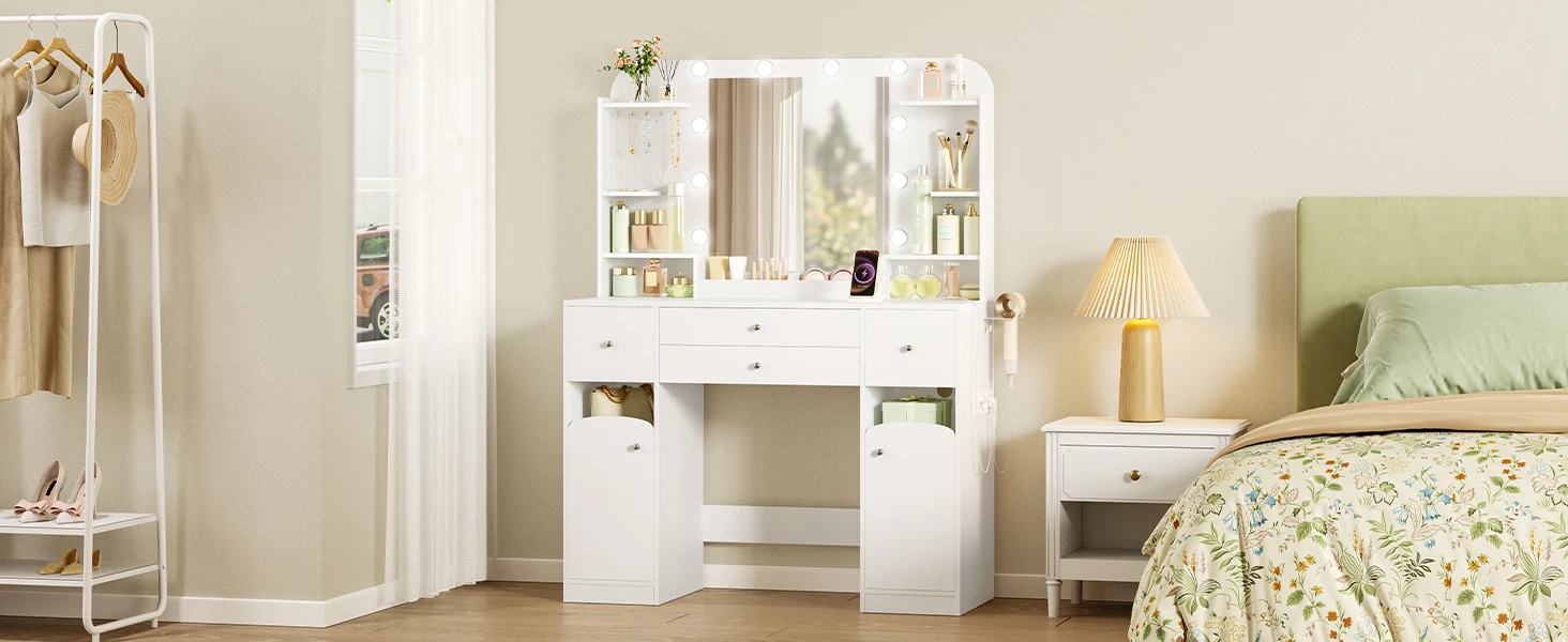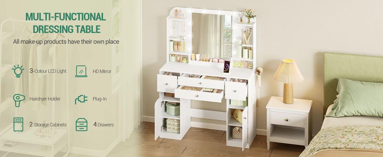 Шкаф для хранения: шкаф для туалетного столика оснащен двумя слоями перегородок, подходящих для хранения косметических инструментов разных размеров, также может удовлетворить потребности в хранении сумок, ящиков для хранения и других крупных предметов;маленькие и крупные предметы на своем месте, удобное хранение и душевное спокойствие