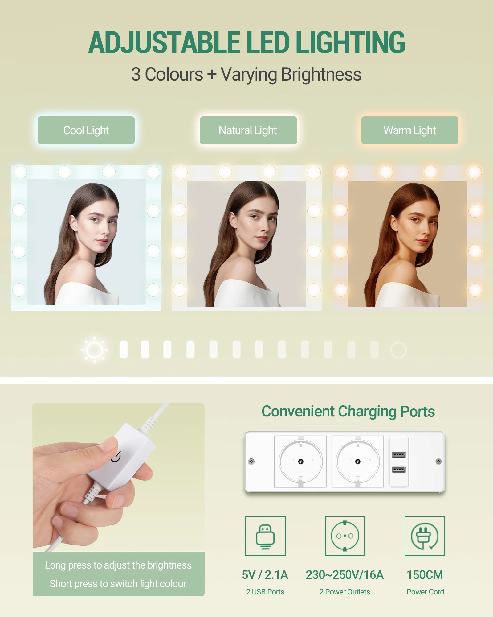 Ежедневное освещение для макияжа: благодаря простоте управления короткое давление можно регулировать на 3 уровнях между теплым светом 3000K и холодным светом 6000K, чтобы создать нежный японский макияж под теплым светом туалетного столика, а холодный свет точно адаптируется к европейскому и американскому тяжелому макияжу, чтобы восстановить наиболее реалистичный цветовой эффект, поэтому вы можете легко справляться с различными стилями.Свет имеет кольцеобразный ровный дизайн распределения света, без слепых зон теней, будь то рисование бровей, теней или уход, может обеспечить точную работу, так что каждый макияж становится светлым и теневым искусством.