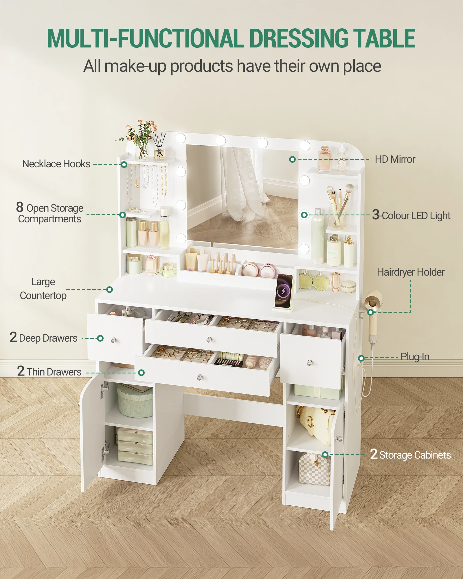 Многофункциональный туалетный столик: с этим многофункциональным туалетным столиком с 2 розетками, 2 портами USB и держателем для фена вы всегда будете иметь под рукой самые важные принадлежности.Мягкое освещение и зеркало высокого разрешения придадут любому образу блеск.Много места для хранения с левой и правой стороны для ухода за кожей, косметики и украшений.