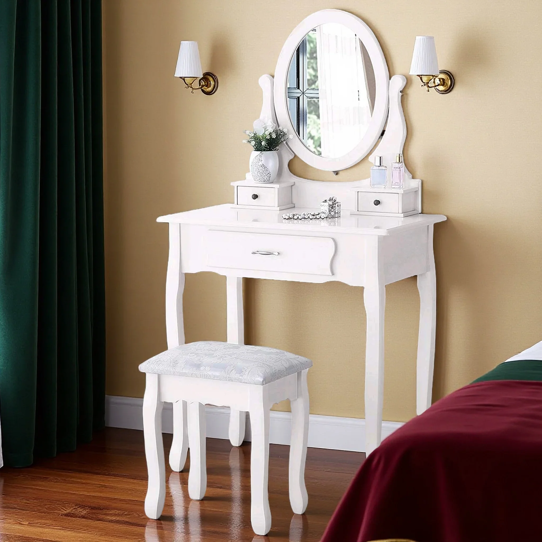 Большой рабочий стол и ящики обеспечивают достаточно места для хранения ваших украшений и косметики.Ручки ящиков выполнены в стиле ретро, что дополняет белый стол. Верхнюю часть туалетного столика можно утащить и использовать как письменный стол. -