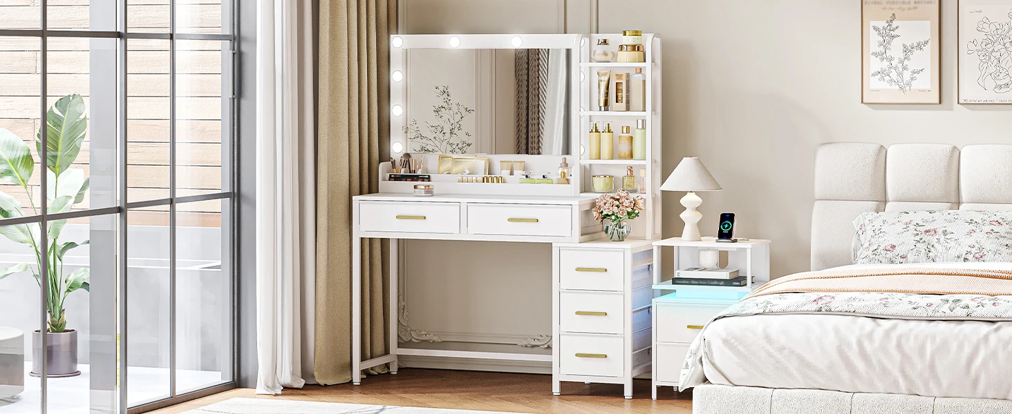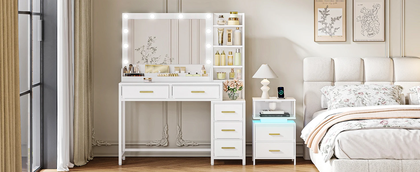 Оснащен аксессуарами для защиты от наклона: этот столик для макияжа оснащен аксессуарами для защиты от наклона, которые позволяют прикрепить его к стене для дополнительной устойчивости и безопасности, чтобы создать более безопасную среду для макияжа.
