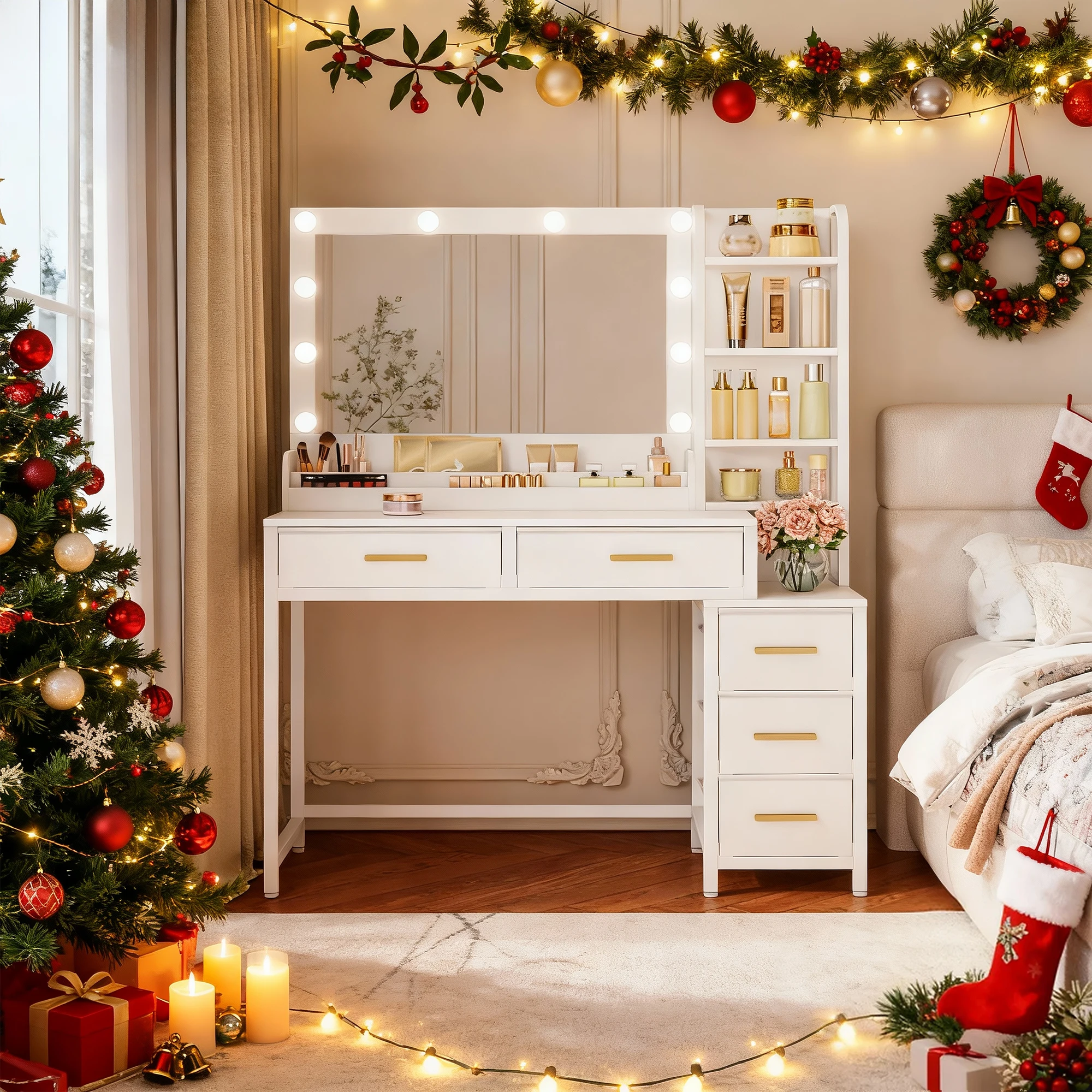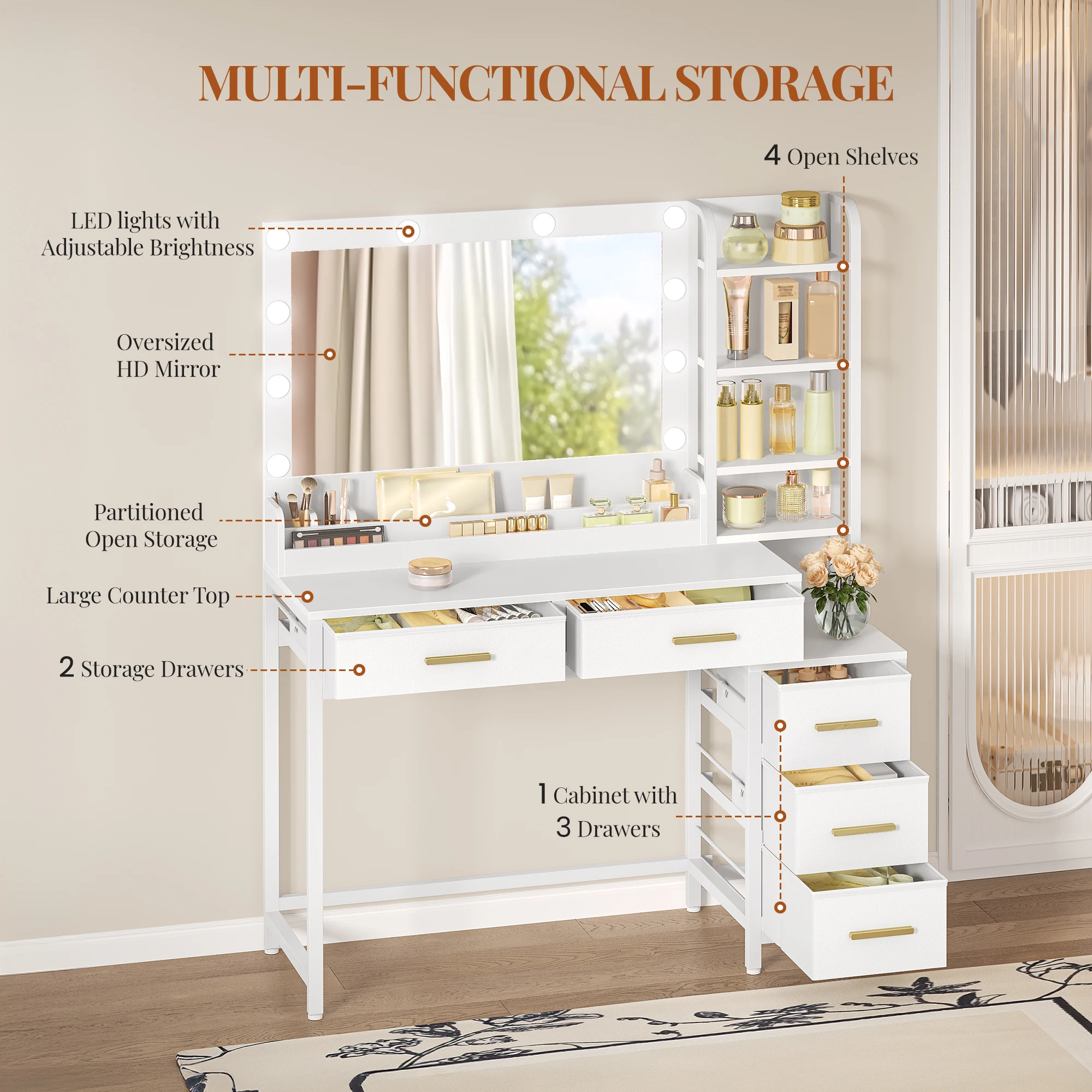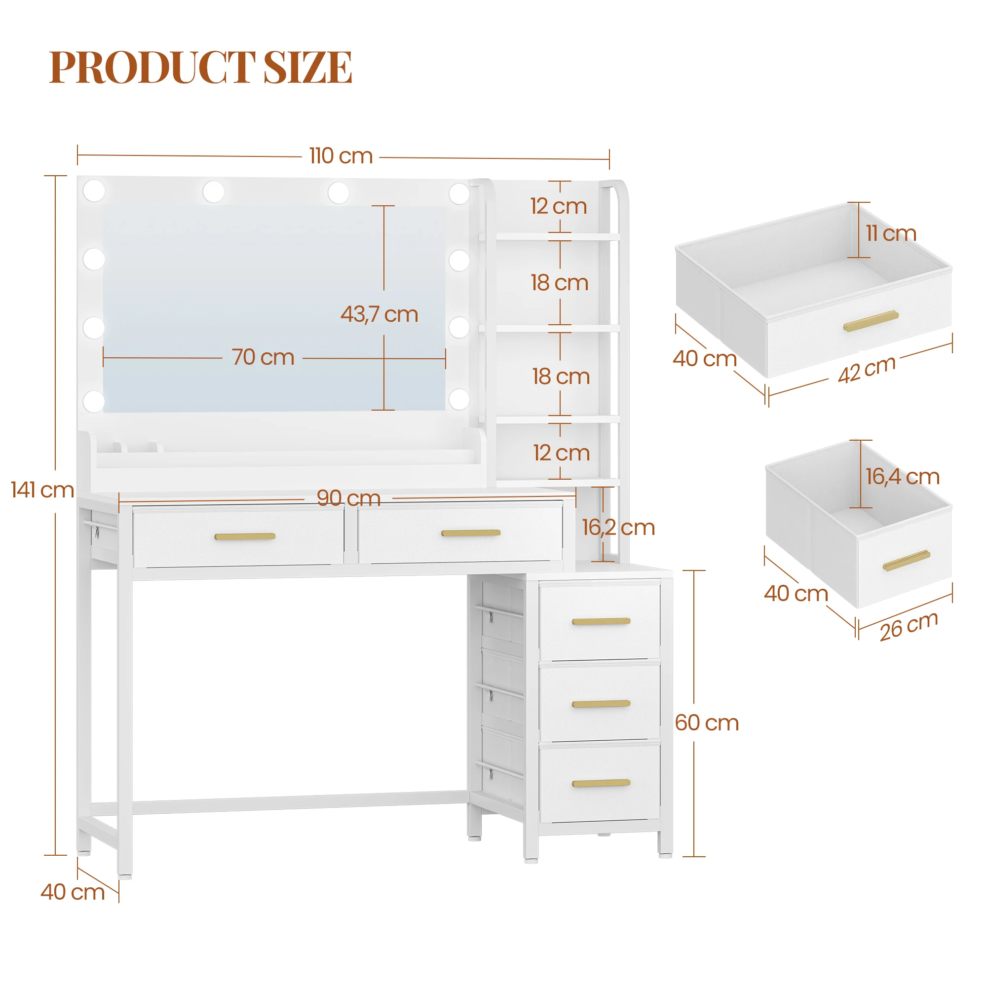 Туалетный столик с большим зеркалом, Туалетный столик с 5 ящиками, 5 открытых отделений, место для хранения перед зеркалом, белый