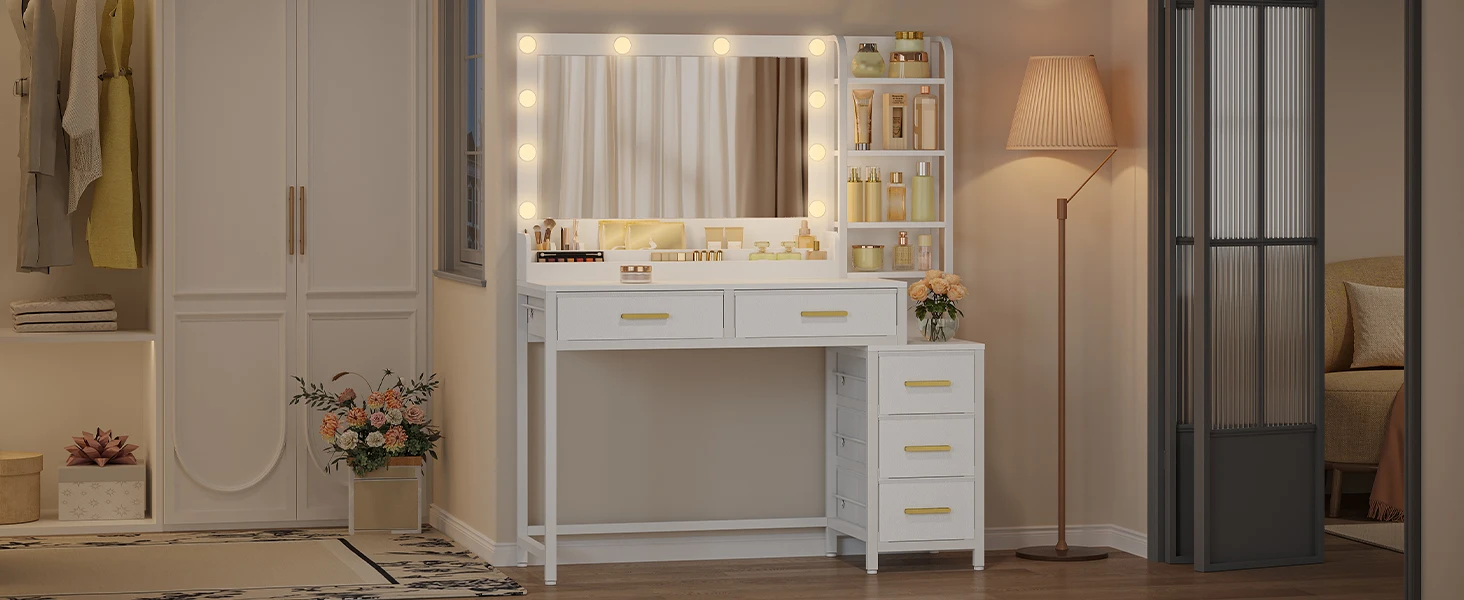 Много места для хранения вещей: столик для макияжа имеет место для хранения перед зеркалом, 5 ящиков и 5 открытых полок.В этом столике для макияжа достаточно места для вашей посуды, поэтому вы можете легко получить доступ к косметике и украшениям, а столешница остается аккуратной, а столешница остается чистой.