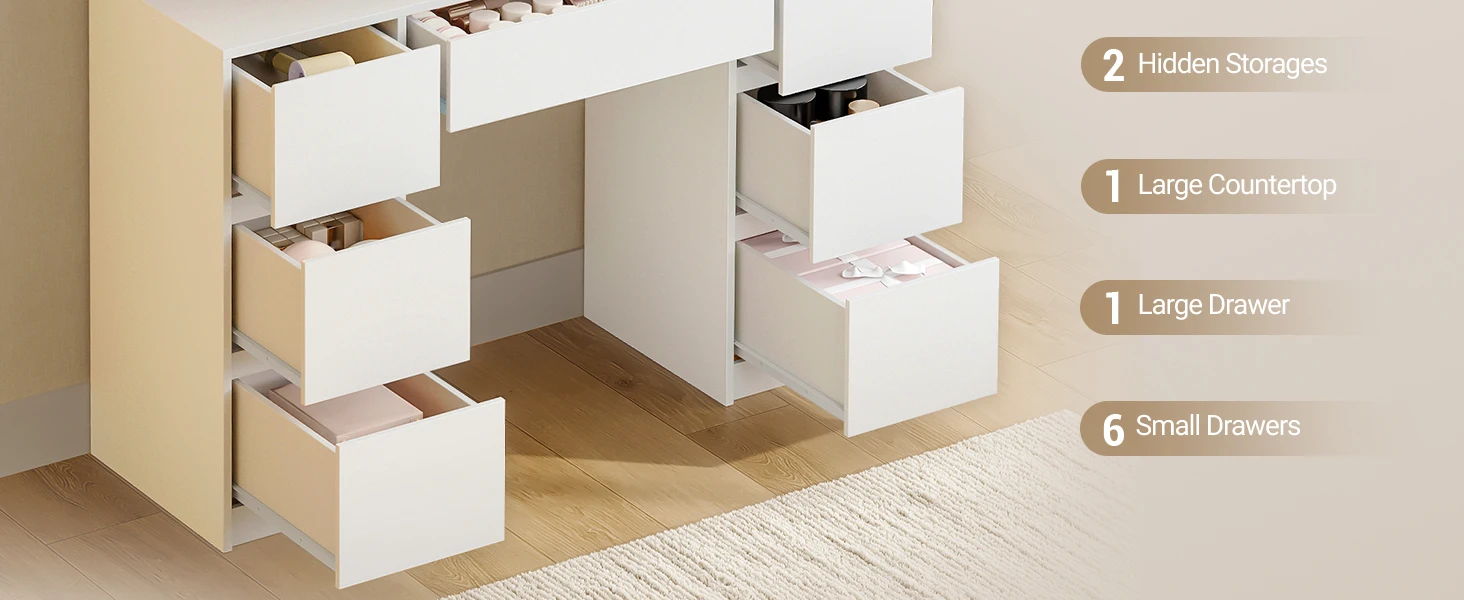 1. [Достаточно места для хранения] Этот туалетный столик с большим зеркалом HD с 7 ящиками, 4 открытыми полками, 1 верхней полкой, дополнительным местом для хранения и крючками для ожерелья за зеркалом, в которые можно аккуратно разместить все необходимое для красоты.Благодаря выдвижным ящикам двух размеров и верхним полкам он может вмещать предметы разных типов для удовлетворения разнообразных потребностей в хранении.