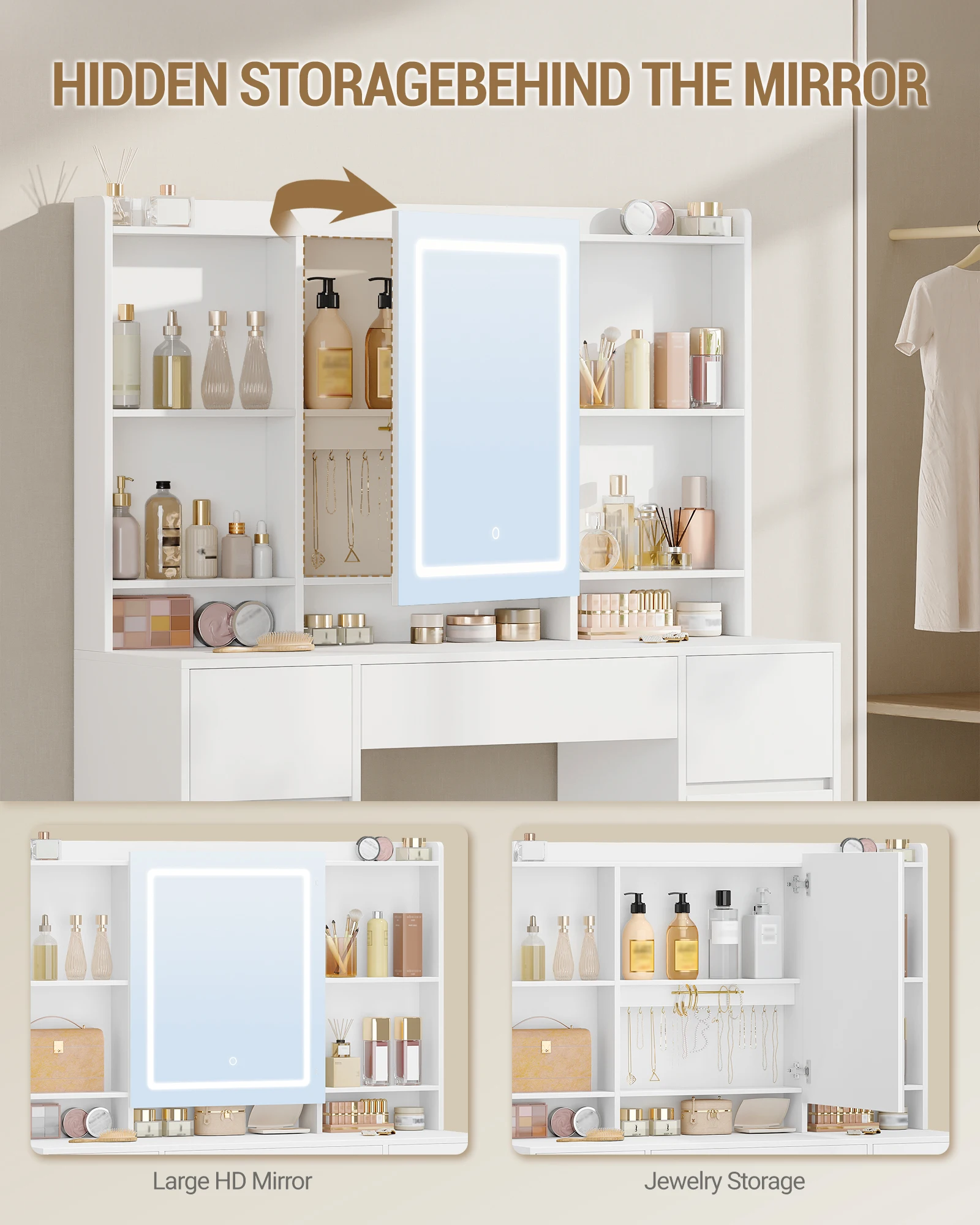 Туалетный столик с подсветкой, большим светодиодным зеркалом, регулируемой яркостью, стол для макияжа с 7 ящиками, 4 полки