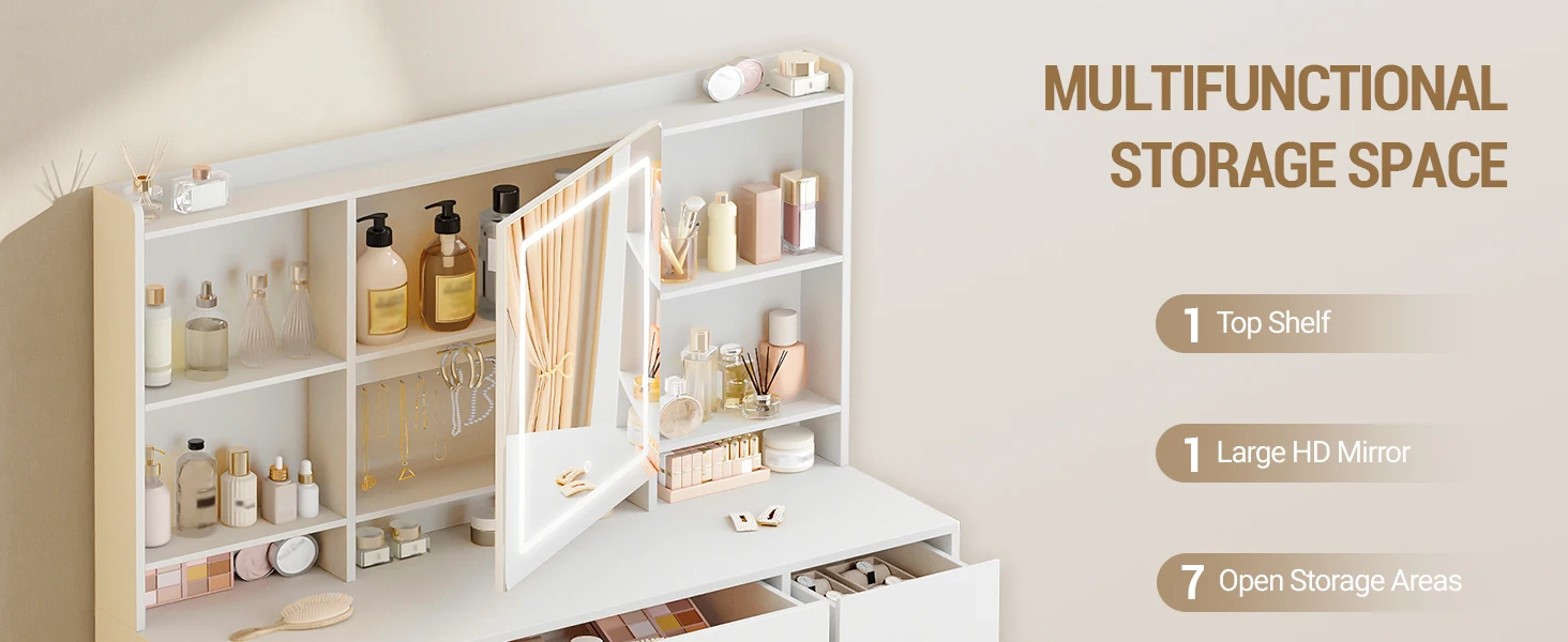 Будьте первым, кто оставил отзыв на “Туалетный столик с подсветкой, большим светодиодным зеркалом, регулируемой яркостью, стол для макияжа с 7 ящиками, 4 полки”