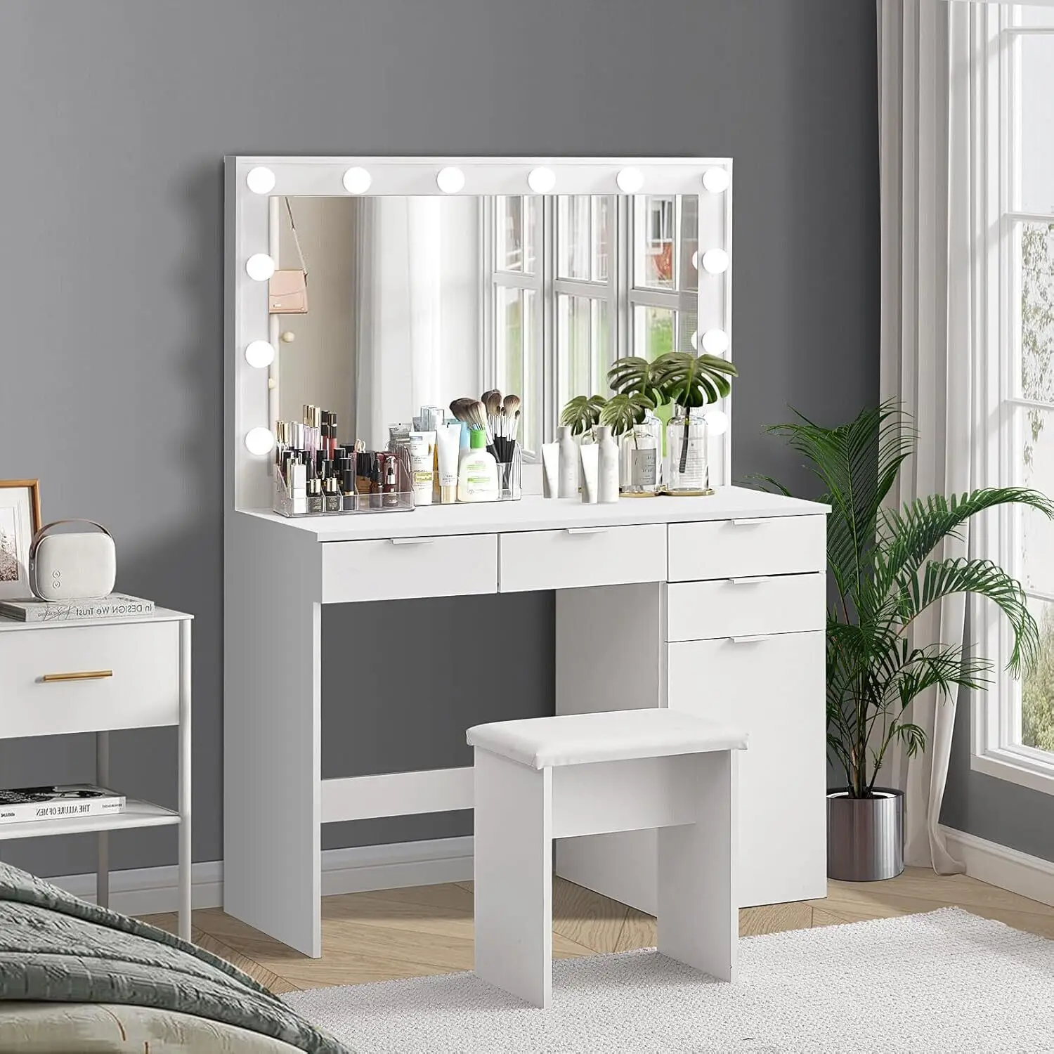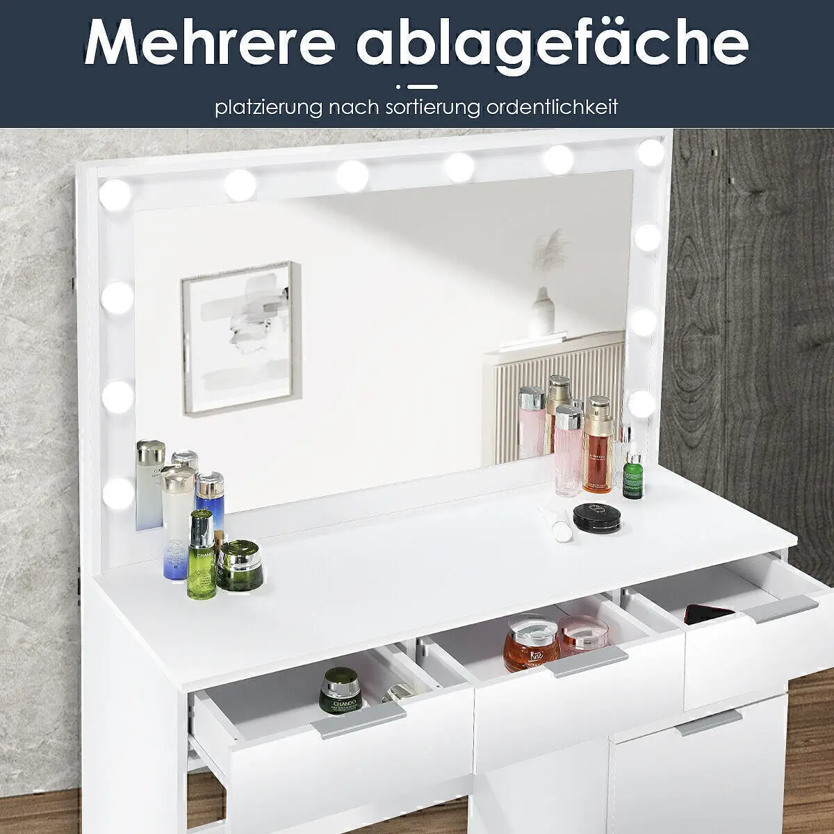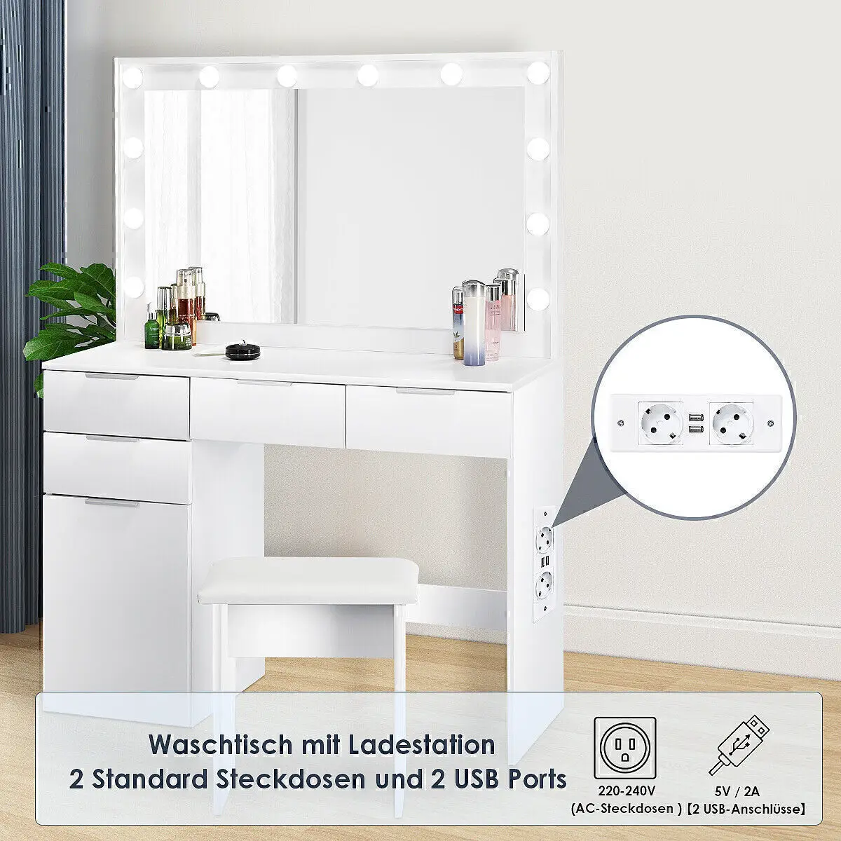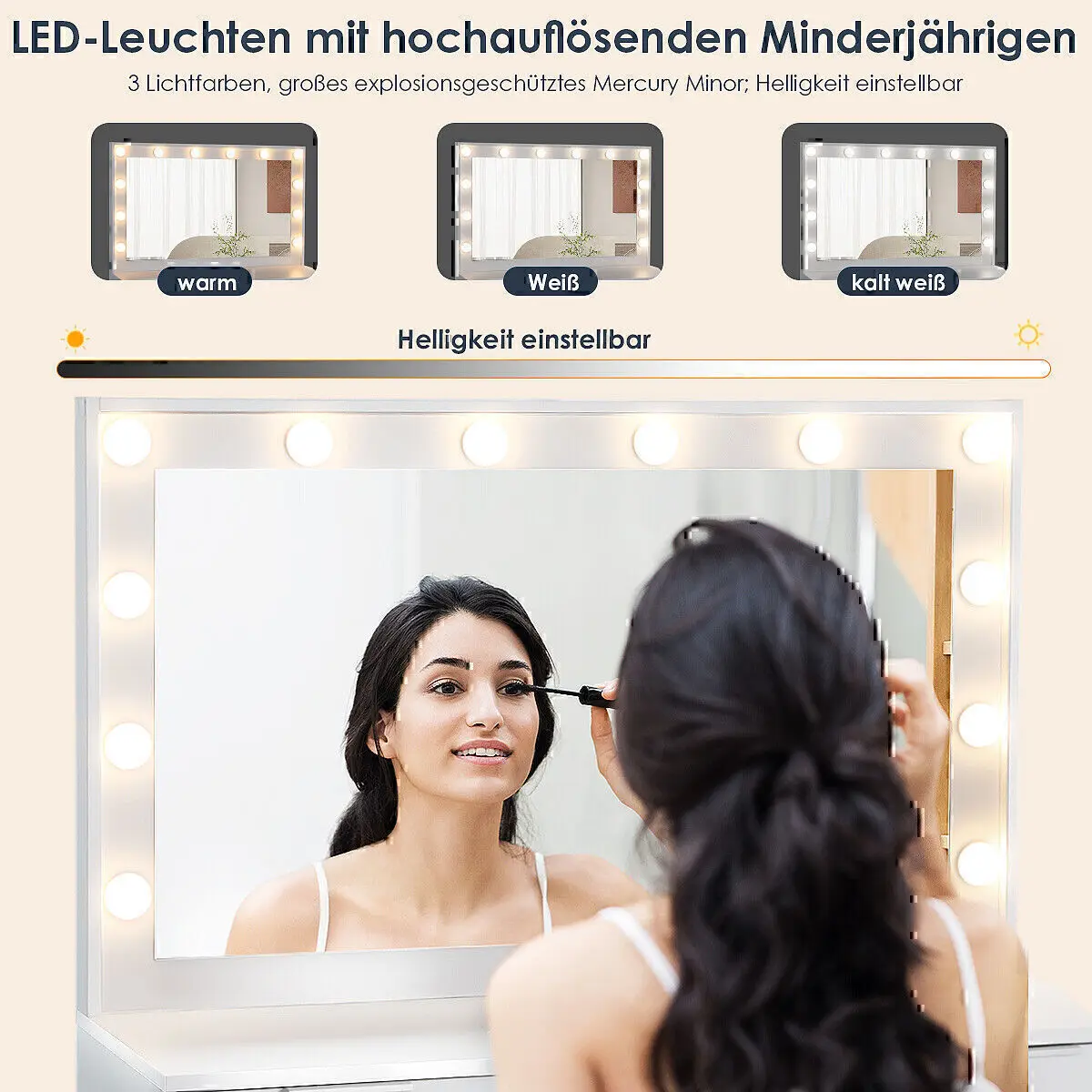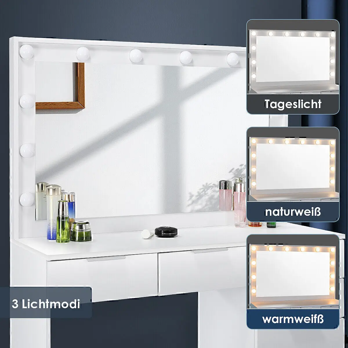Оптимальный светильник для макияжа: будь то белый свет для дневного макияжа или теплый белый цвет для вечеринки, туалетный столик с подсветкой обеспечит идеальный свет.Просто отрегулируйте желаемый цвет и яркость с помощью переключателя.