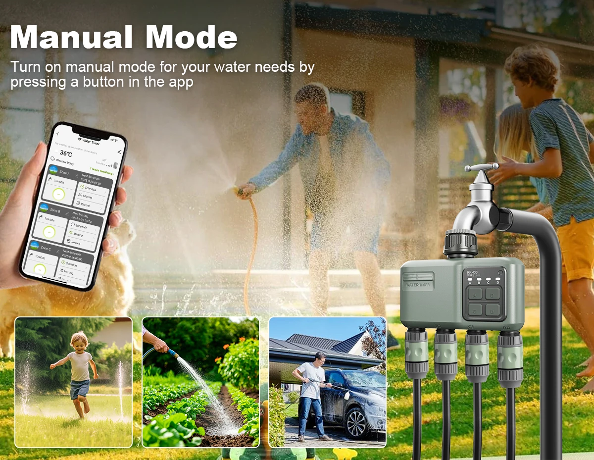 【Задержка дождя и ручной полив】Выходное отверстие для шлангового таймера 4 оснащено функцией задержки дождя, которую вы можете настроить на пропуск полива с 1 до 7 дней для экономии воды. Если вам нужно немедленно полить, вы можете получить доступ к ручному режиму с помощью клапанного блока или через приложение, чтобы использовать кран, когда он вам понадобится.