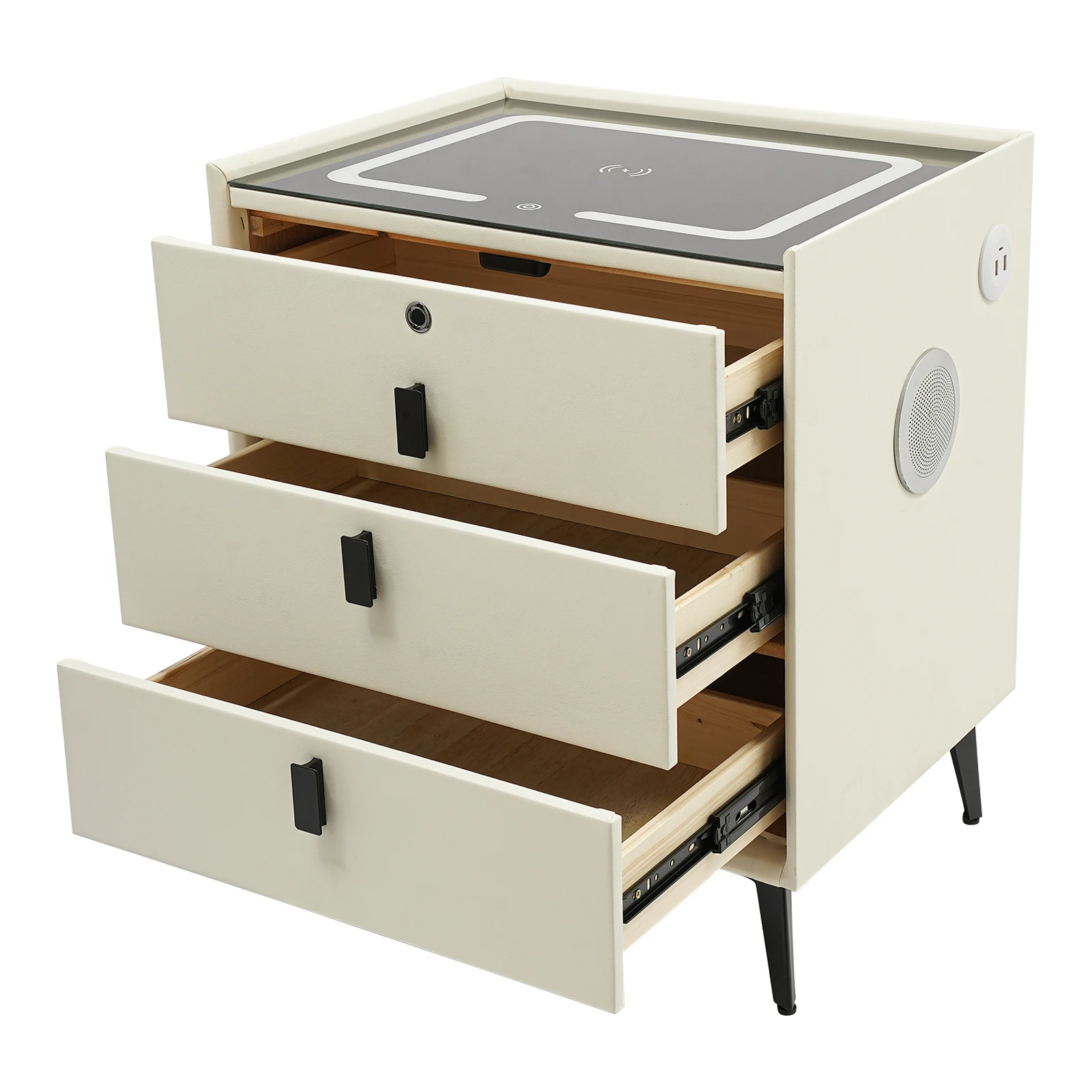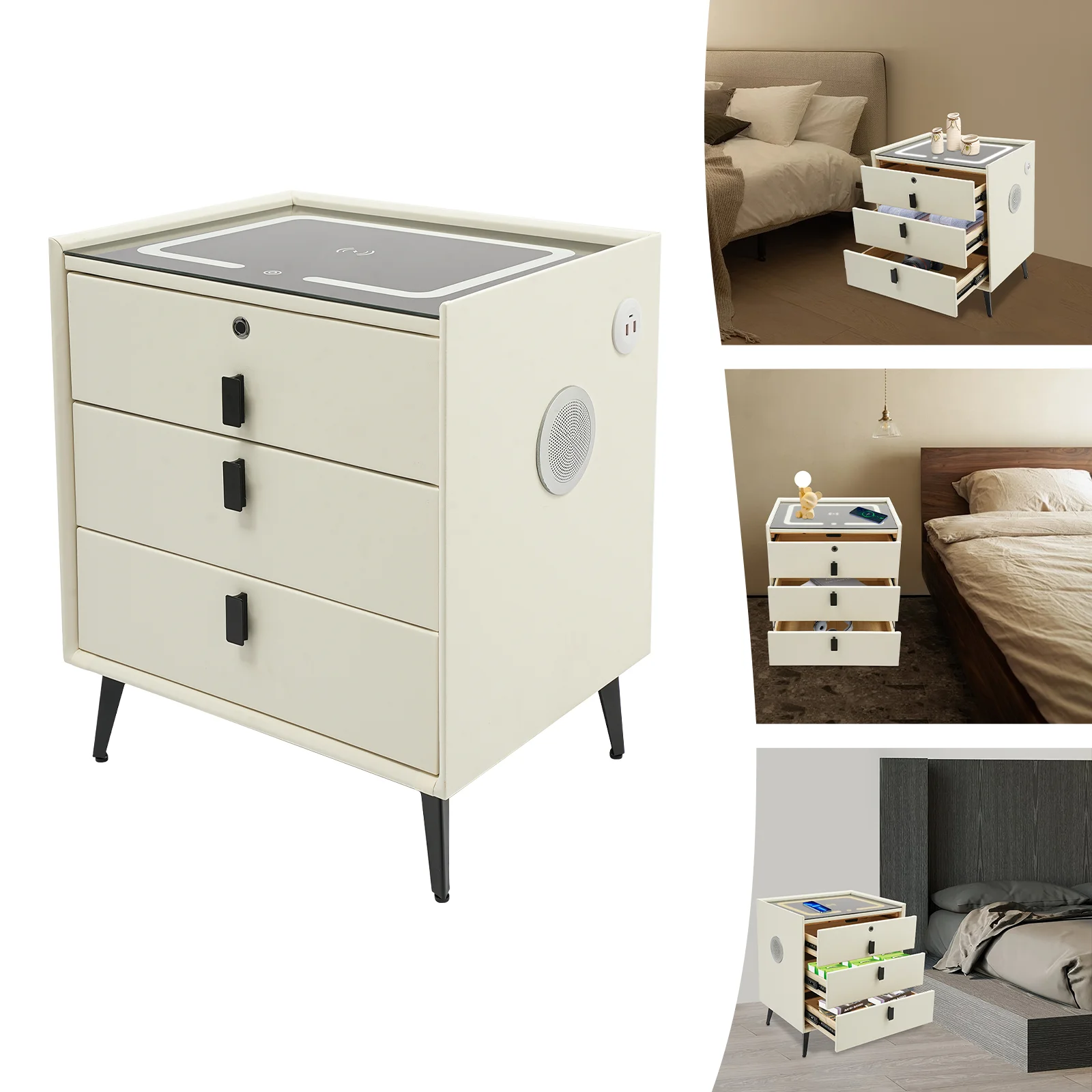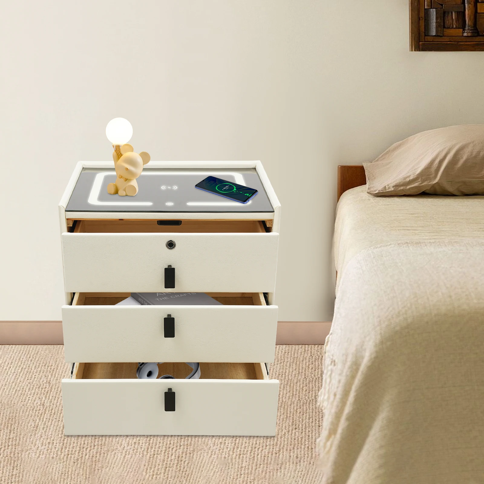 Умная прикроватная тумбочка с 3 ящиками, USB, трехцветный светодиодный порт для беспроводной зарядки, замок по отпечатку пальца, Bluetooth для спальни, гостиной