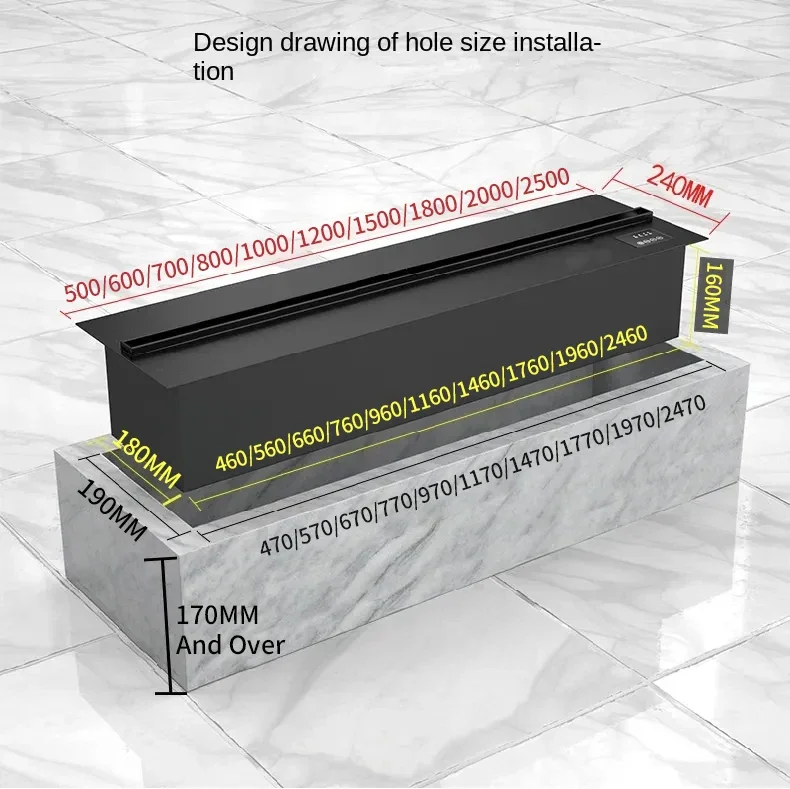 Размер монтажного отверстия камина: длина 970 мм * ширина 190 мм * высота 170 мм (полая внутри)