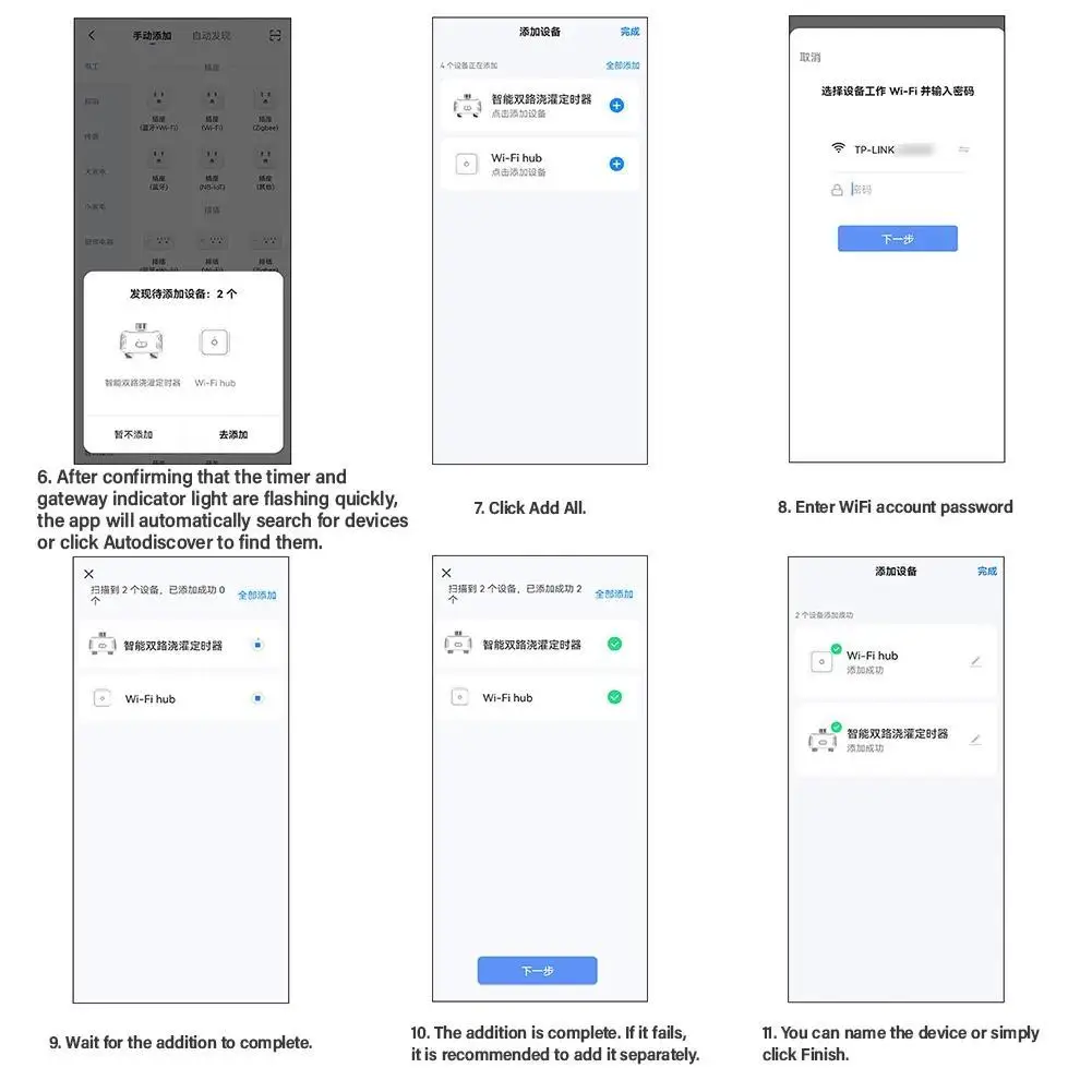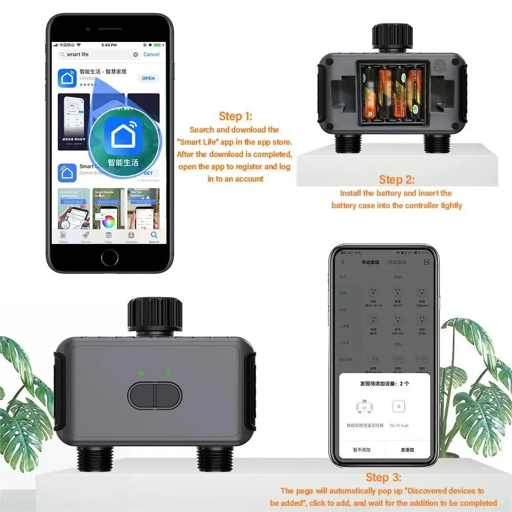 2.Нажмите и удерживайте одну из кнопок в течение 6 секунд, пока оба зеленых индикатора не начнут быстро мигать одновременно, чтобы таймер воды оставался в режиме сопряжения.Нажмите «Добавить устройство», чтобы добавить таймер в концентратор.Выберите «Добавить новое устройство»