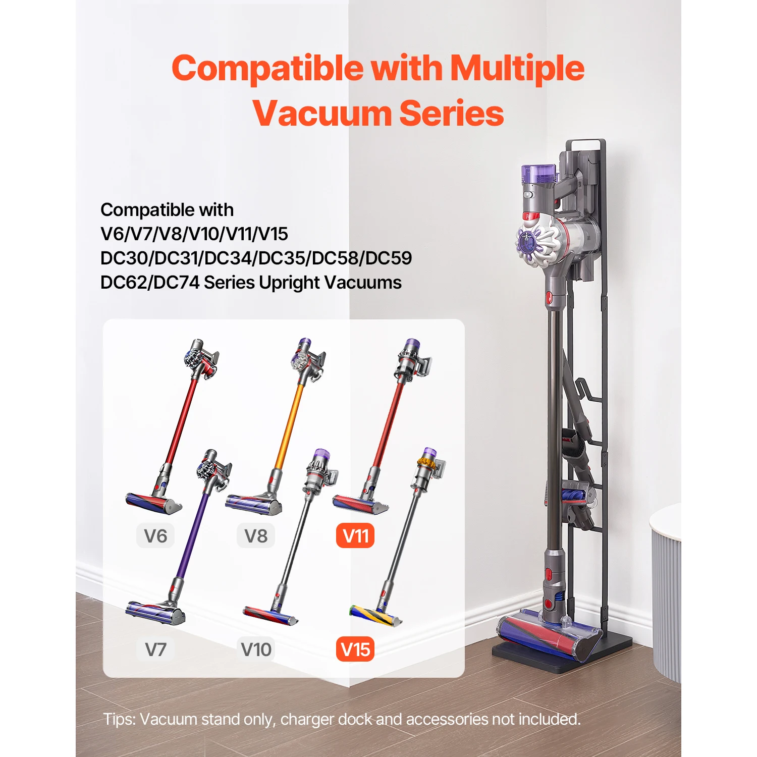 Широкая совместимость: эта подставка, разработанная специально для пылесосов Dyson, совместима с несколькими моделями Dyson (V6, V7, V8, V10, V11, V15, DC30, DC31, DC34, DC35, DC58, DC59, DC62, DC74).Он эффективно хранит ваш пылесос и аксессуары на кухне, в гостиной или гараже, освобождая ценное пространство.Примечание. Только вакуумная подставка, док-станция для зарядного устройства и аксессуары в комплект не входят.