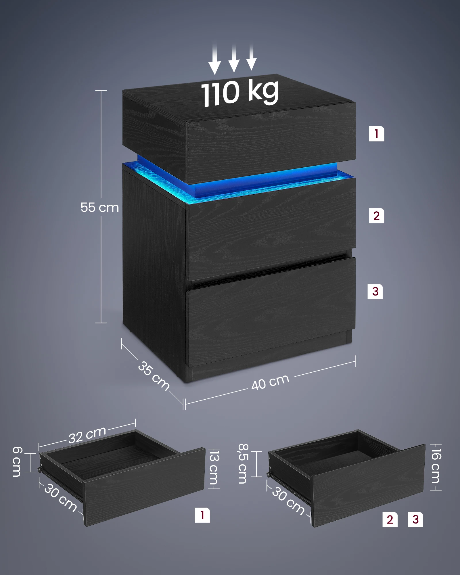 [Светодиодный освещение с регулируемыми цветами и режимами]25 цветов, 6 уровней яркости, 3 режима мигания и 6 частот мигания-Настройте светодиодный освещение ночного комода с помощью прилагаемого пульта дистанционного управления для создания различной атмосферы