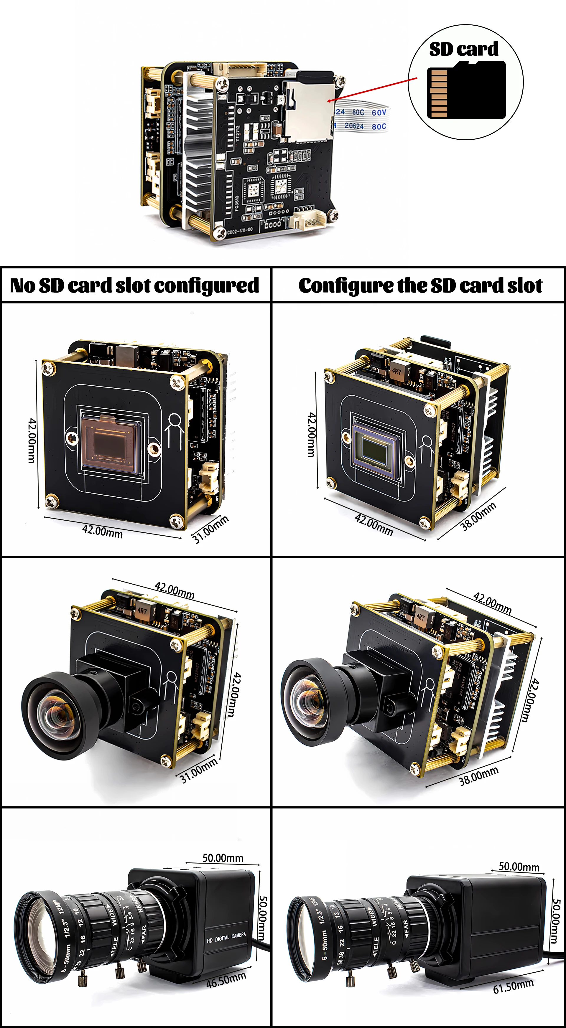 38x38mm, Fixing screw hole position 34mm*34mm, lens mount hole distance 22mm |