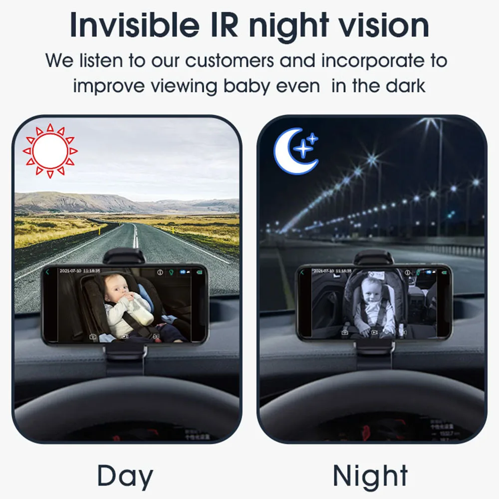 Детская Автомобильная камера с ночным видением:Детская Автомобильная камера поддерживает функцию ночного видения, у вас будет четкое изображение даже при движении ночью. Невидимый инфракрасный свет не заставит вашего ребенка чувствовать себя некомфортно.