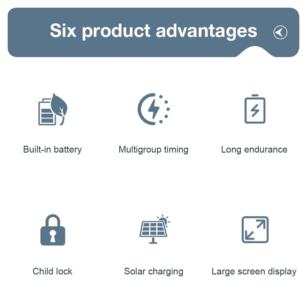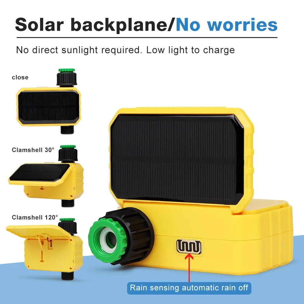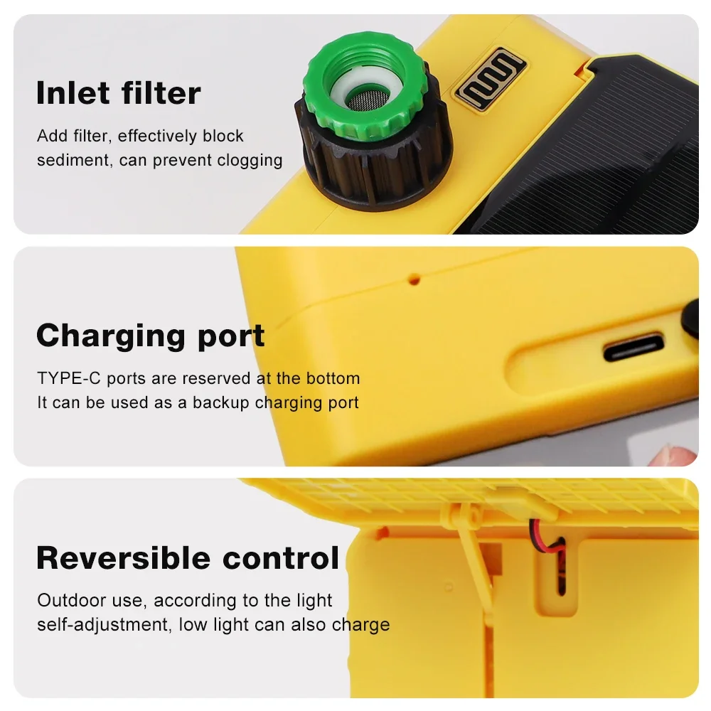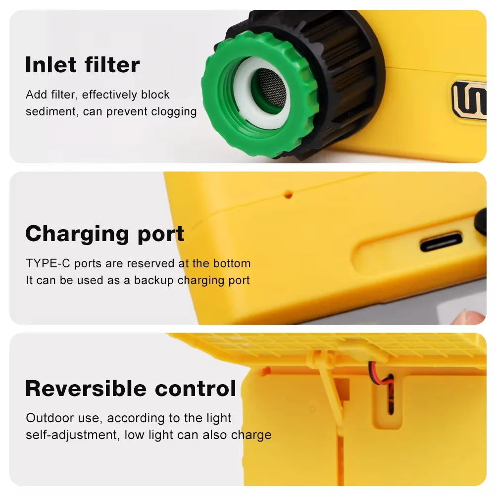 1.Солнечная энергия: оснащен высокопроизводительными солнечными панелями, не требует прямого солнечного света и может заряжать встроенную батарею в пасмурные дни и дни при слабом освещении, вообще не беспокоясь о электроэнергии, идеально подходит для ежедневных задач по орошению.Оснащен запасным портом для зарядки типа C внизу.