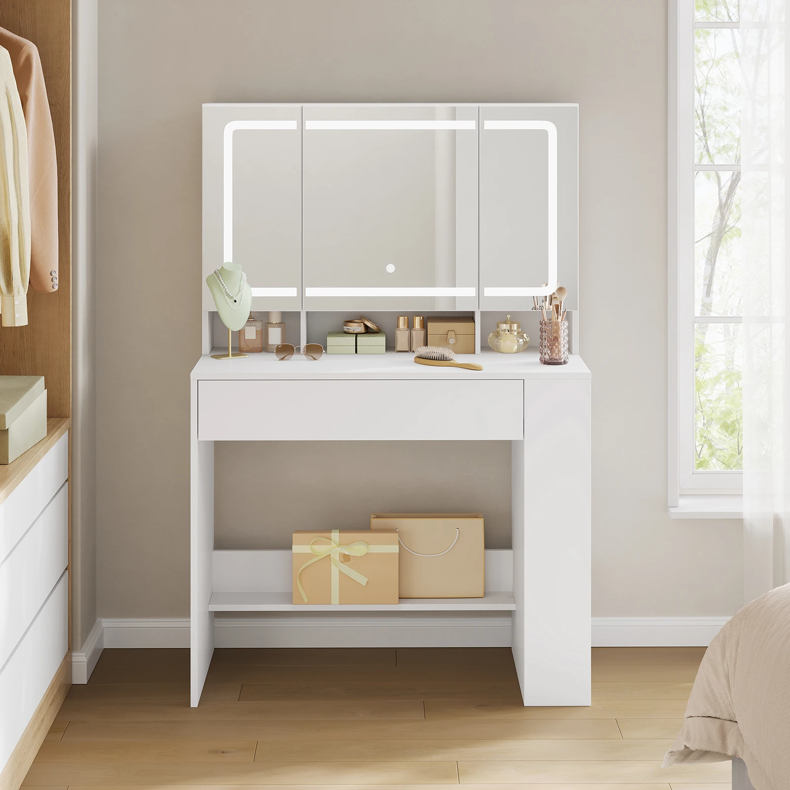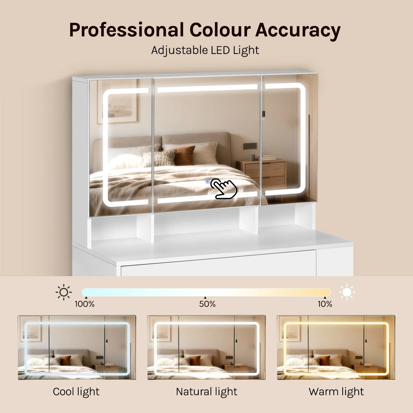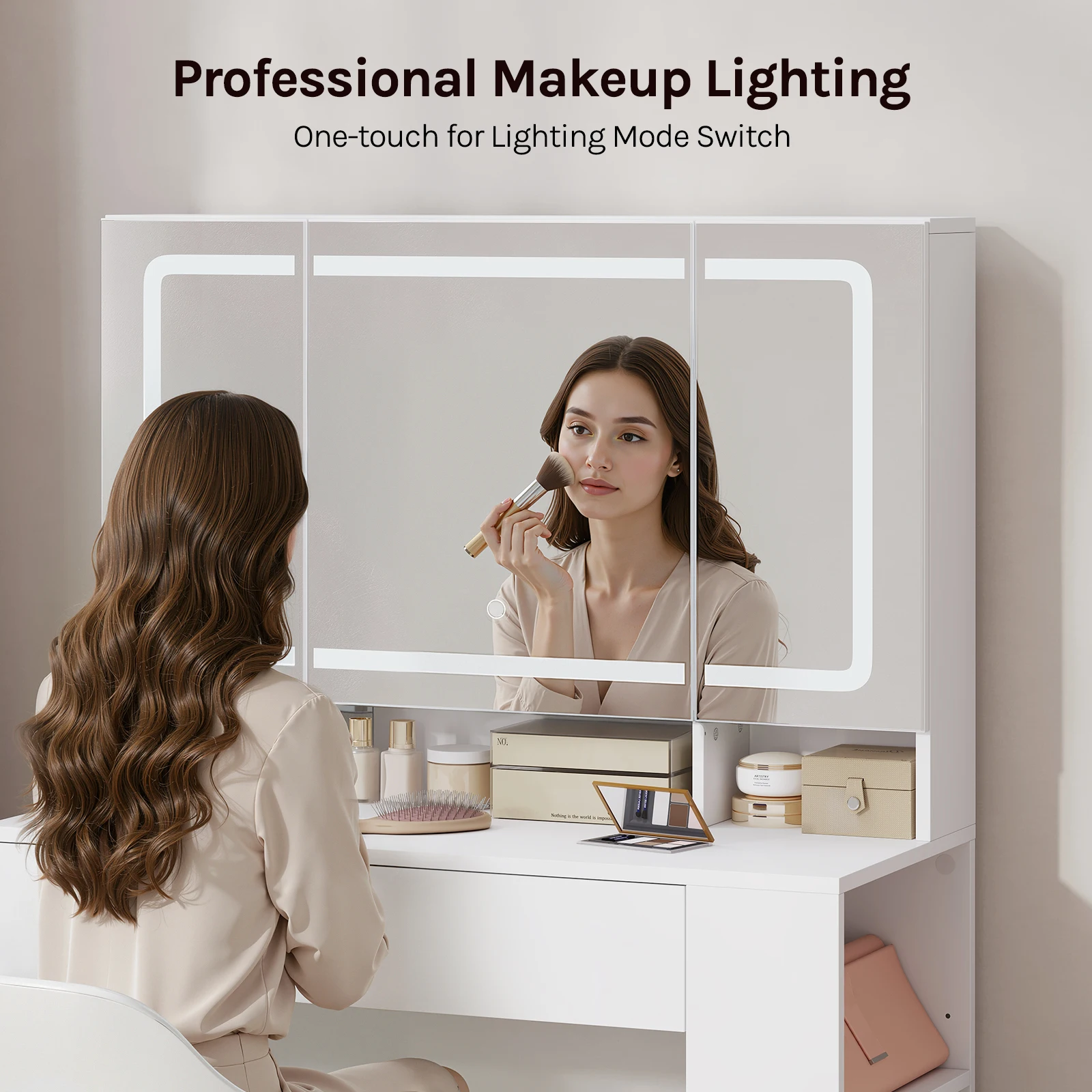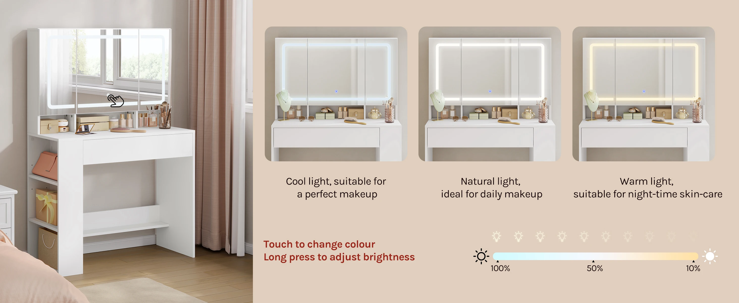• ДИММИРУЕМЫЕ СВЕТОДИОДНЫЕ ЗЕРКАЛО: Белый туалетный столик с зеркалом (90×49 см) может обеспечить прекрасное отражение с высоким разрешением.Режим освещения можно переключать между прохладным светом, естественным светом и теплым светом, с бесступенчатой регулировкой яркости для легкого макияжа и ухода за кожей.