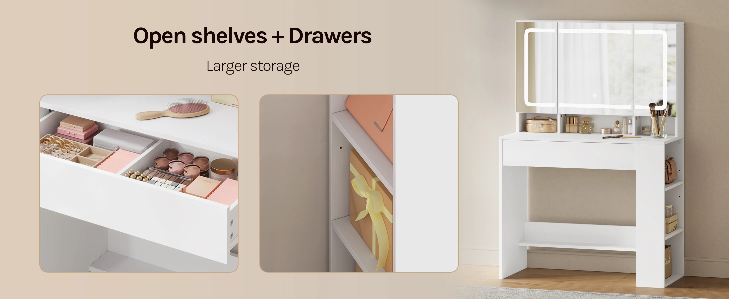 • РАЗЛИЧНОЕ И РАЗЛИЧНОЕ ХРАНЕНИЕ: туалетный столик имеет множество мест для хранения вещей, включая 1 столешницу (90×40 см), 1 большой ящик, 2 шкафа (2+3 яруса) и 1 шкаф для украшений за зеркалом, 3 отделения на столе и 3-х ярусный боковой стеллаж.Вы можете организовывать средства по уходу за кожей, косметику, украшения, ежедневные вещи.