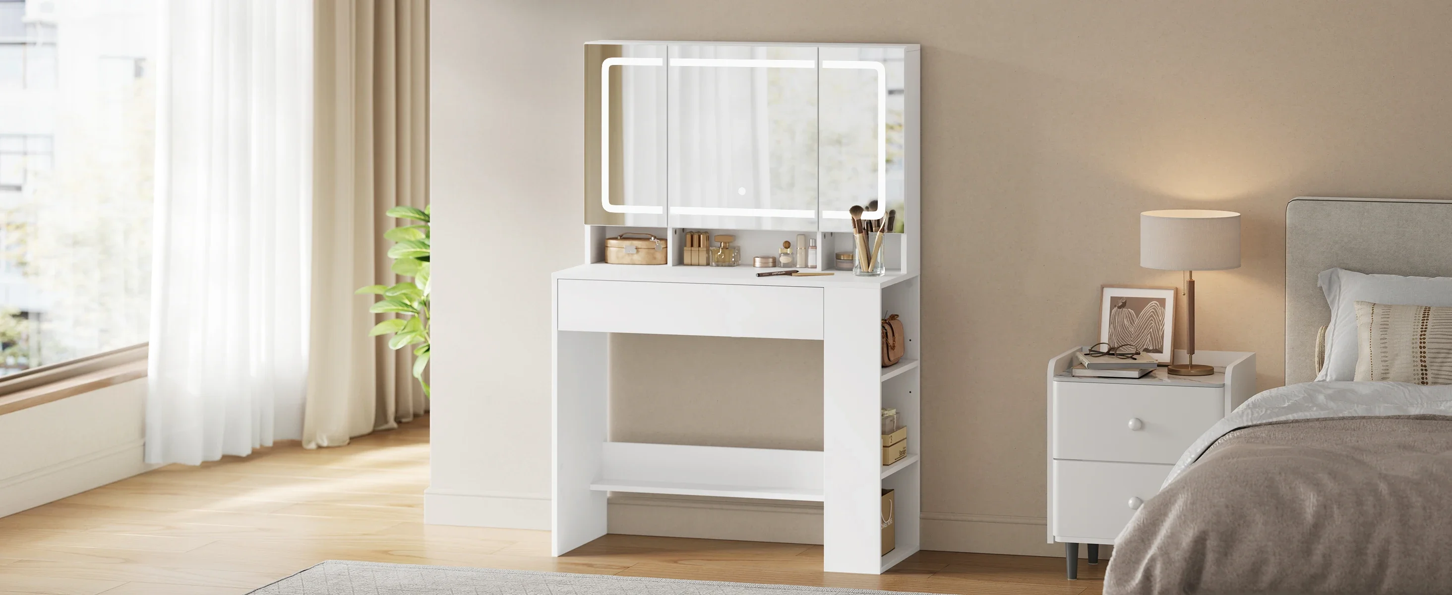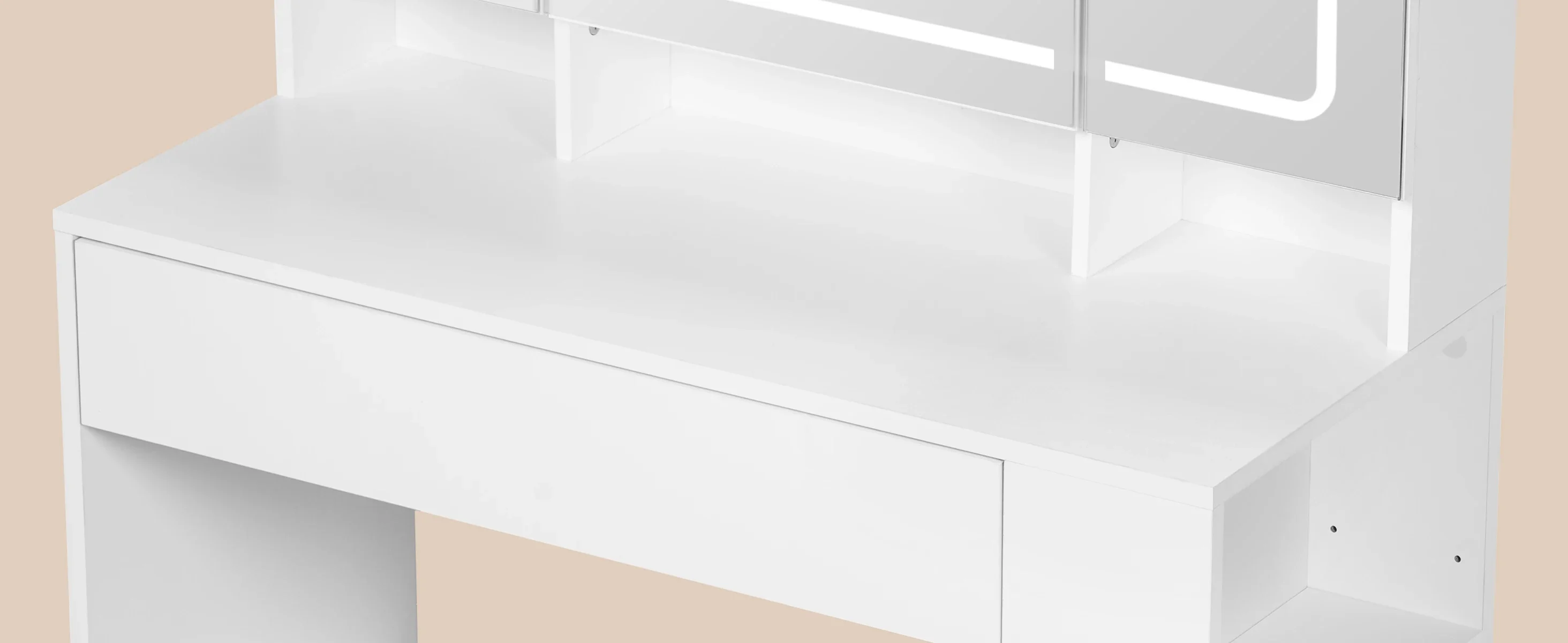 • УНИВЕРСАЛЬНЫЙ СТИЛЬ: этот компактный дизайн подходит как для больших, так и для маленьких комнат, аккуратно вписывается в уютные углы, не занимая много места, создавая идеальный уголок для макияжа.Невероятная времени эстетика столика для макияжа легко дополняет различные интерьеры, делая его практичным и стильным дополнением к любой комнате.