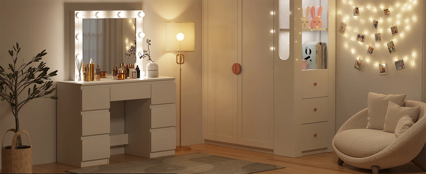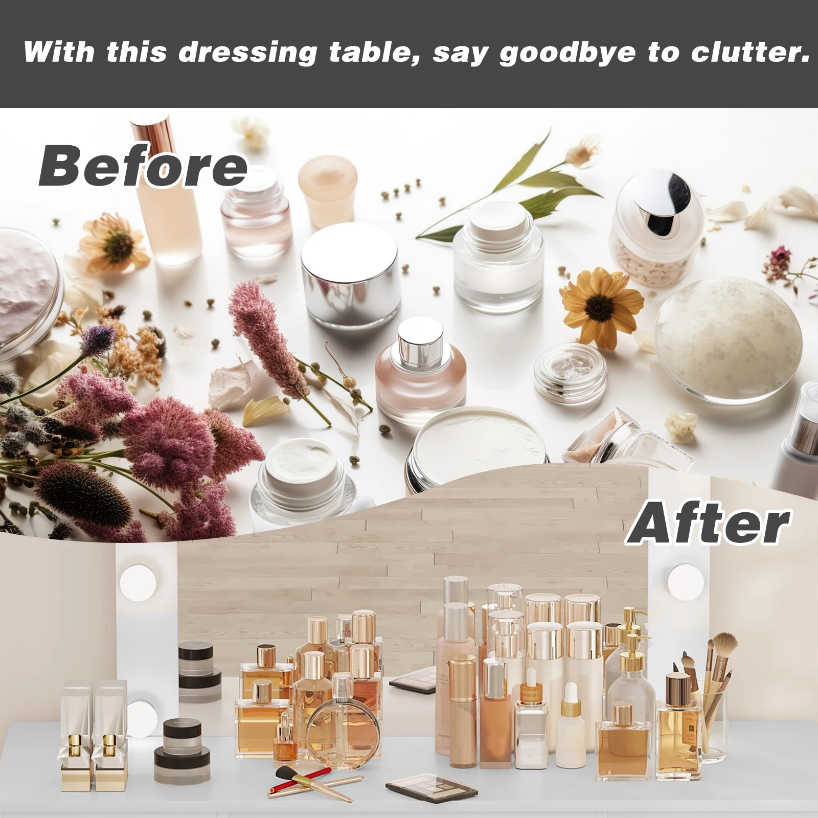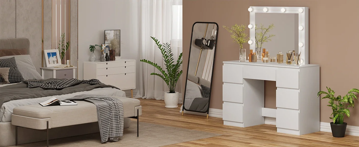 • Большое место для хранения: 7 ящиков с металлическими направляющими обеспечивают достаточно места для хранения туалетных принадлежностей, косметики и украшений в организованном порядке в соответствии с категориями.Просторная столешница предлагает вам достаточно места для макияжа.
