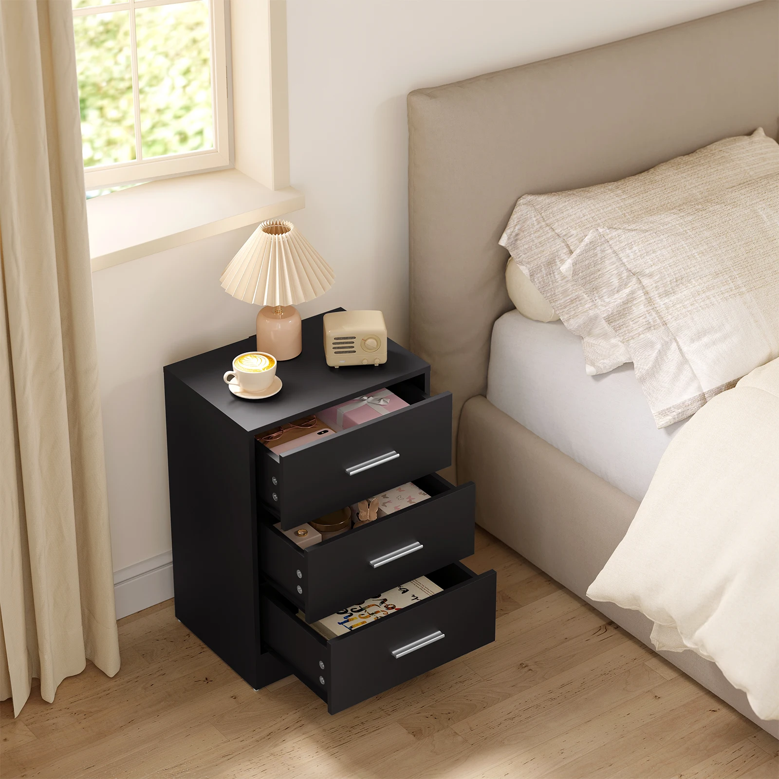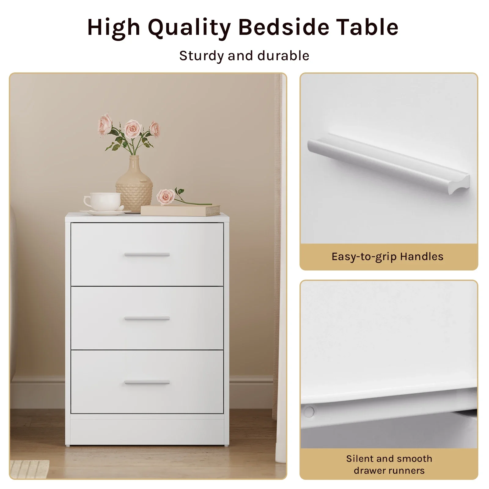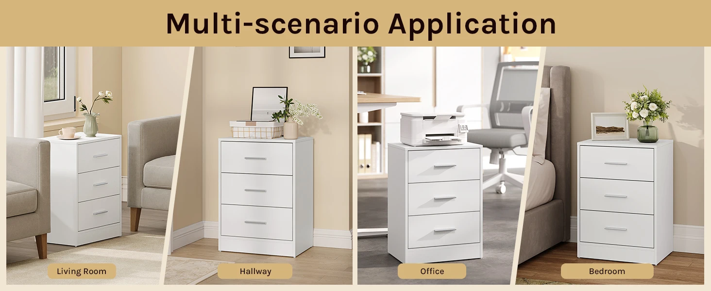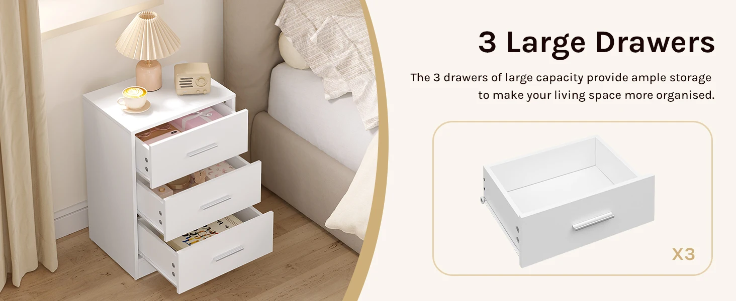 • Практичный и многофункциональный: благодаря трем ящикам большой вместимости и элегантному внешнему виду прикроватная тумбочка практична и может использоваться во многих местах, например.в качестве прикроватной тумбочки в спальне, шкафа для документов в офисе, приставного столика в гостиной, стола в прихожей и т. д.