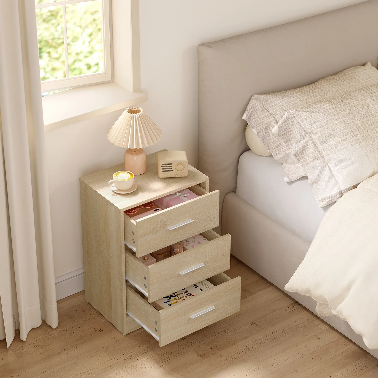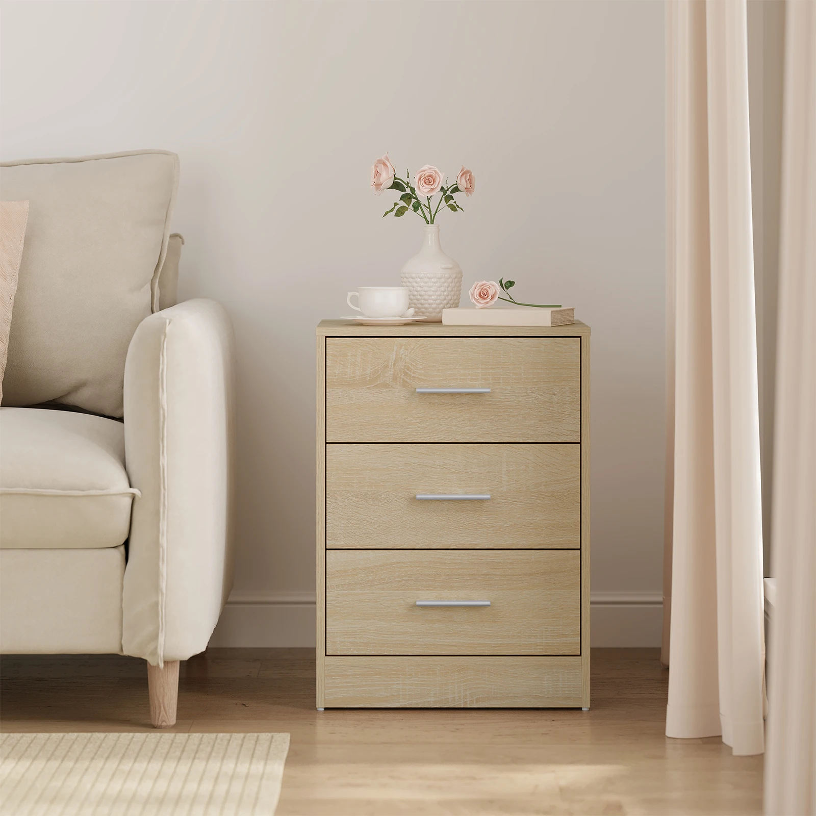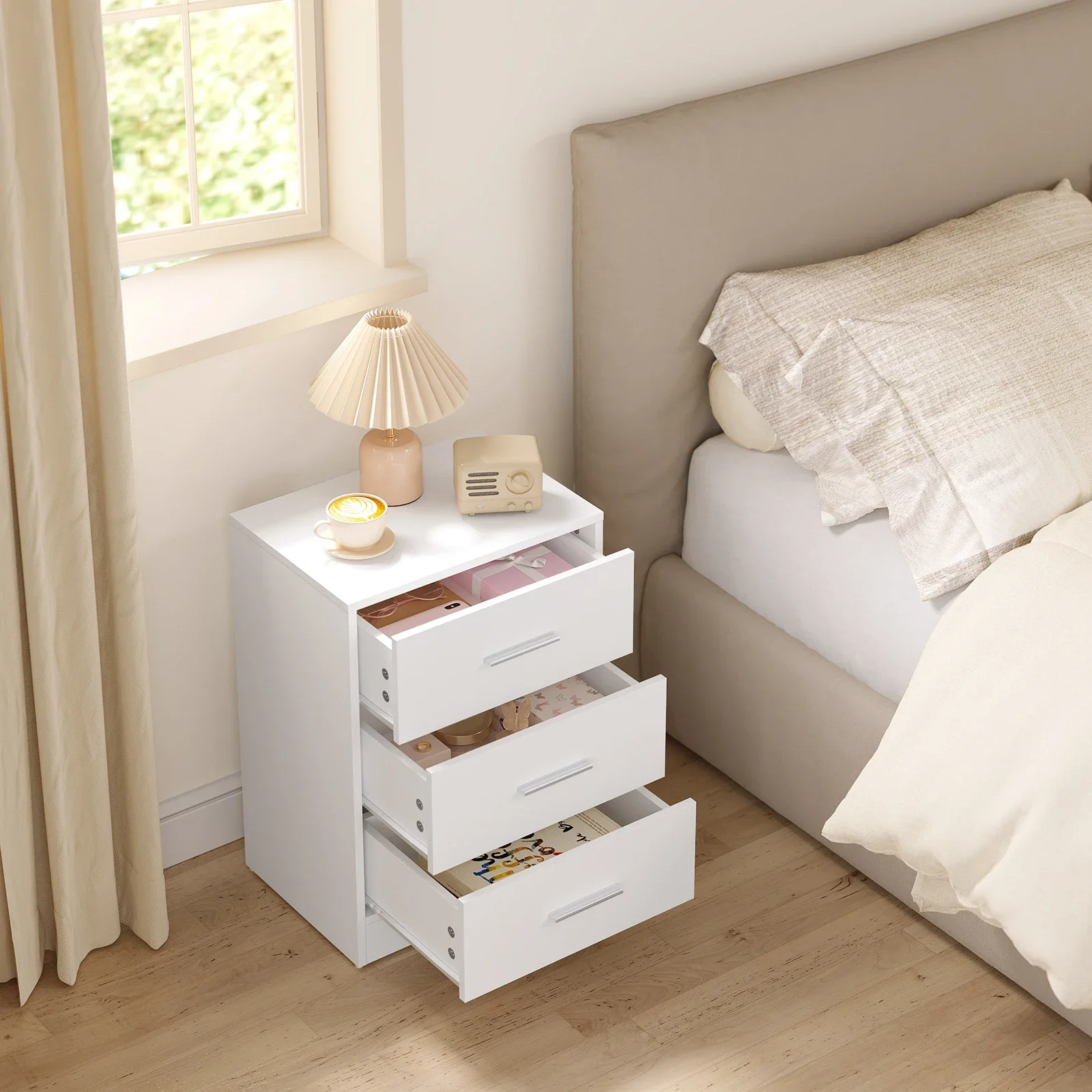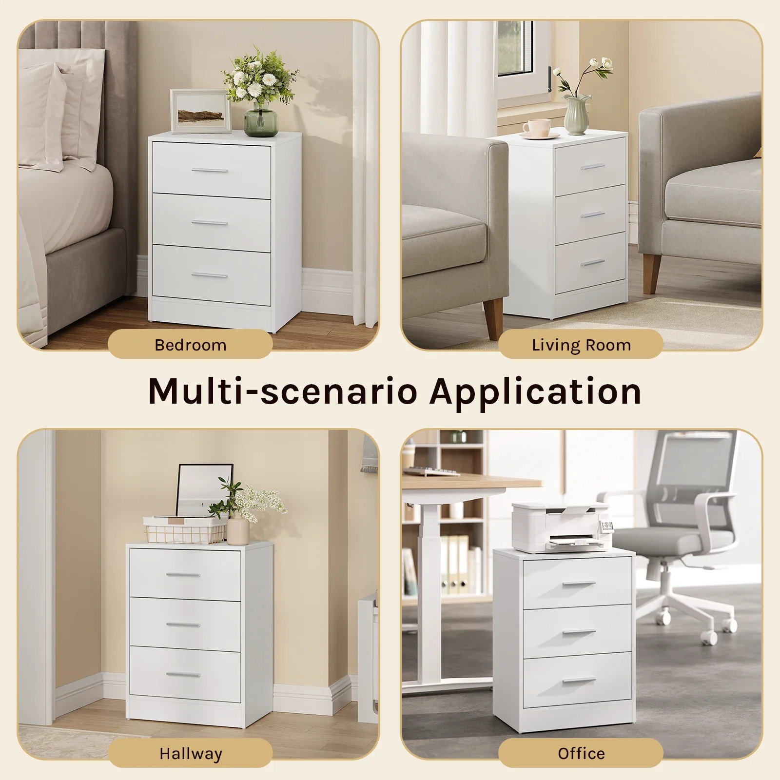 • Практичный и многофункциональный: благодаря трем ящикам большой вместимости и элегантному внешнему виду прикроватная тумбочка практична и может использоваться во многих местах, например.в качестве прикроватной тумбочки в спальне, шкафа для документов в офисе, приставного столика в гостиной, стола в прихожей и т. д.