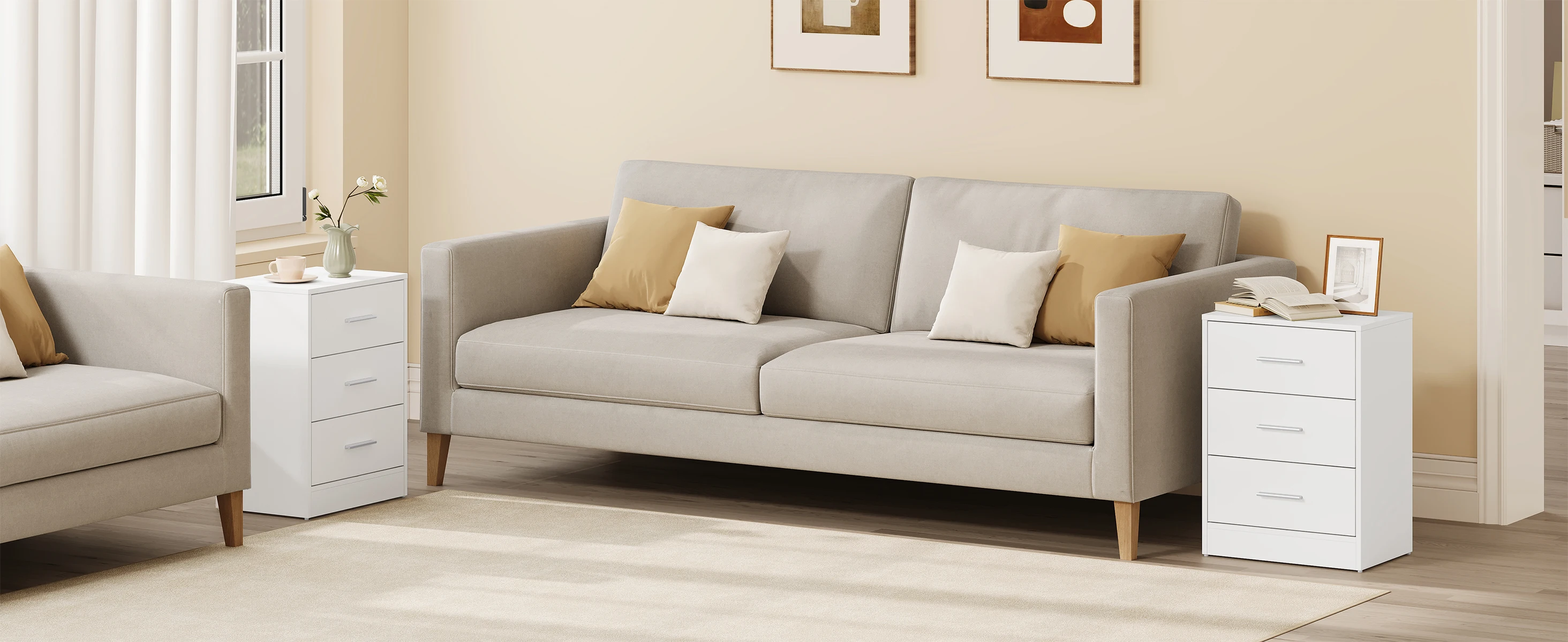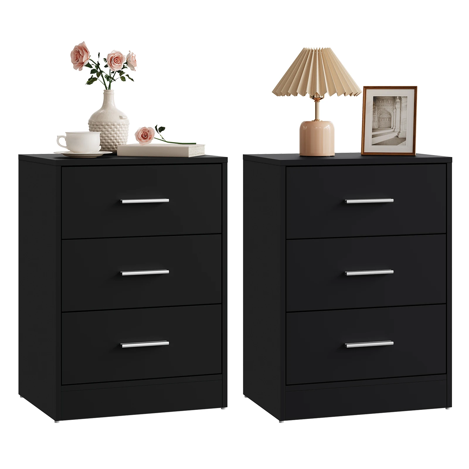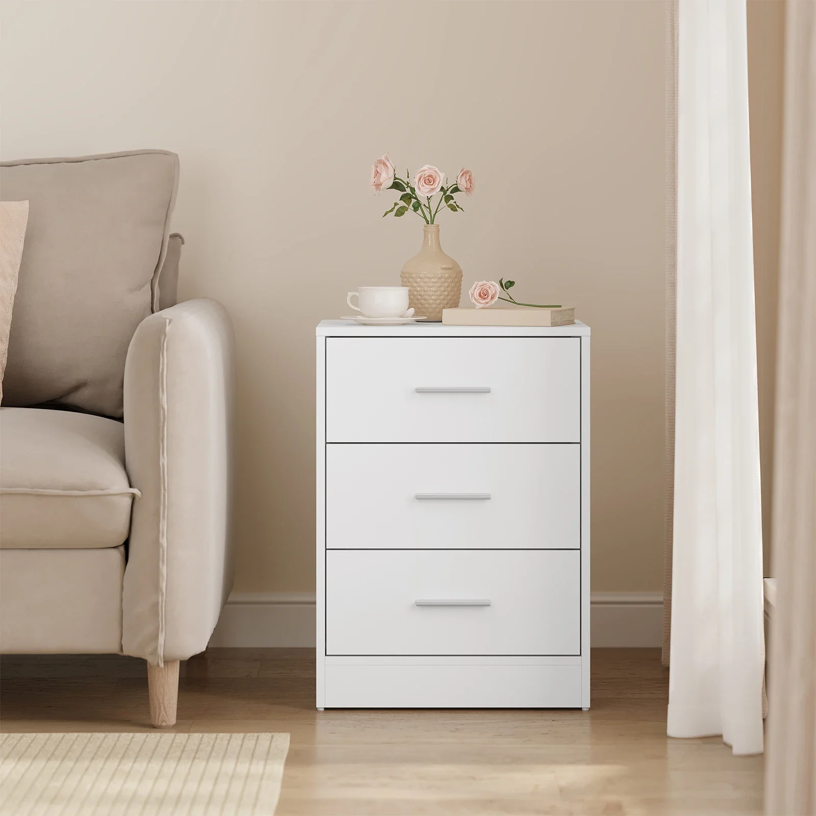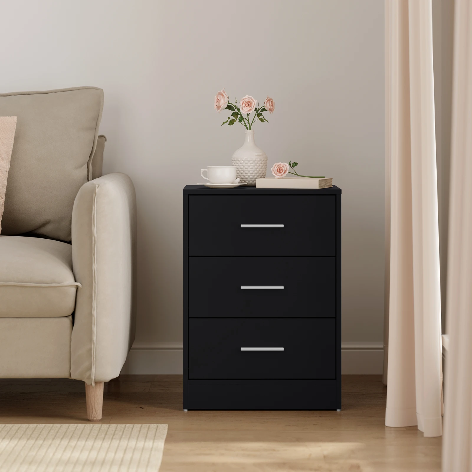• Практичный и многофункциональный: благодаря трем ящикам большой вместимости и элегантному внешнему виду прикроватная тумбочка практична и может использоваться во многих местах, например.в качестве прикроватной тумбочки в спальне, шкафа для документов в офисе, приставного столика в гостиной, стола в прихожей и т. д.