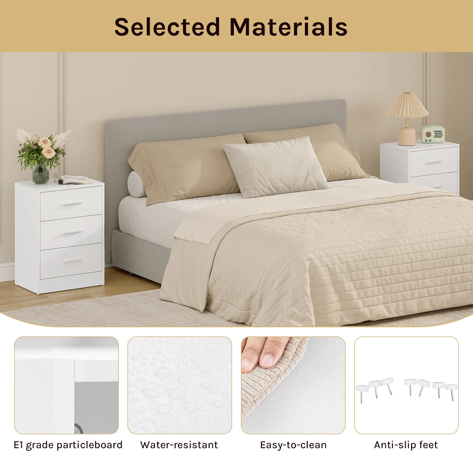 • Прочный и устойчивый: прикроватная тумбочка изготовлена из высококачественного ДСП класса E1 и МДФ, поэтому она очень прочная, стабильная и долговечная в использовании.Кроме того, поверхность шкафа обработана меламиновым шпоном, гладким и легко чистящимся.Нескользящие подушечки для ног защищают пол и повышают устойчивость.